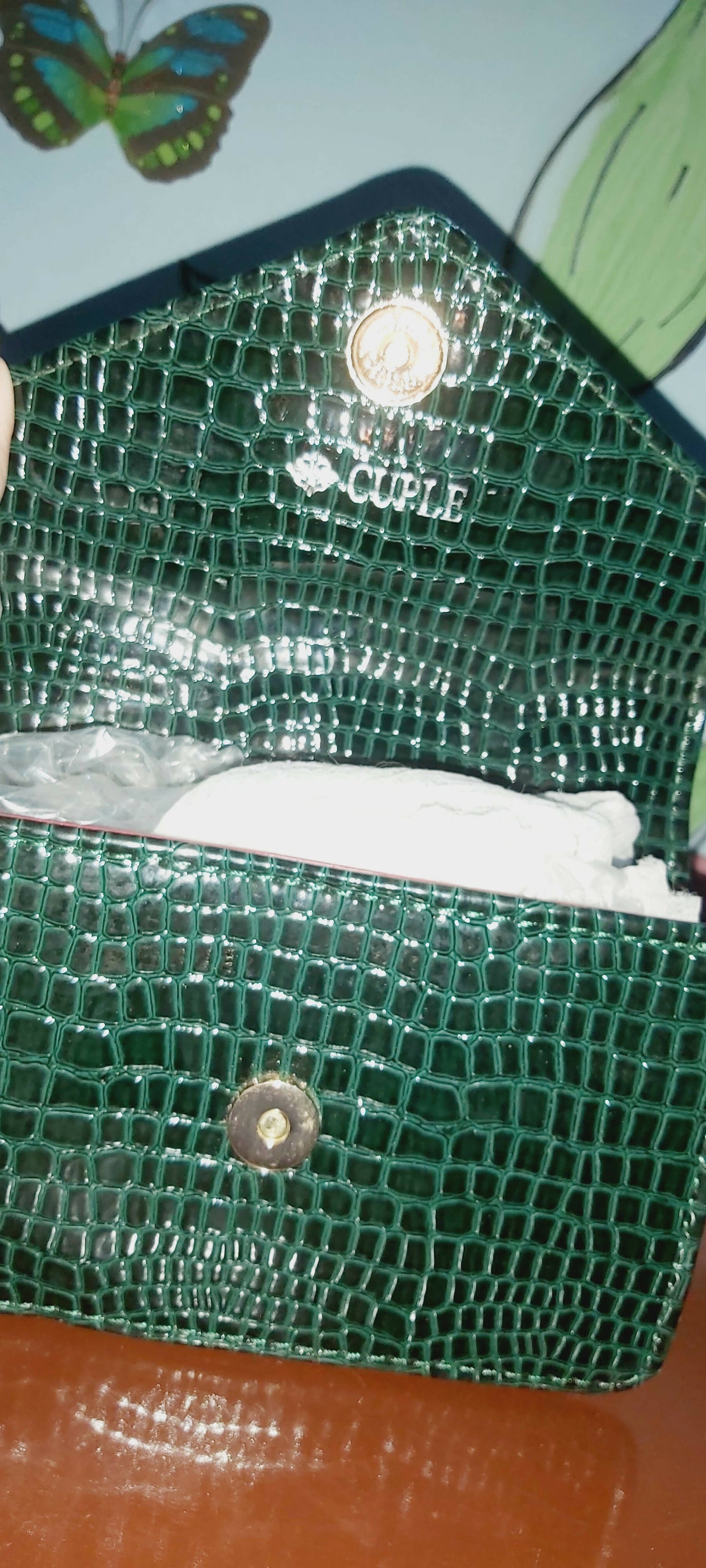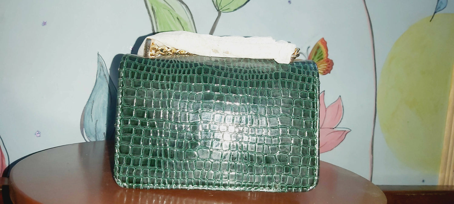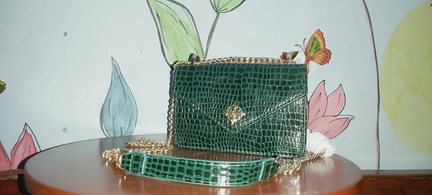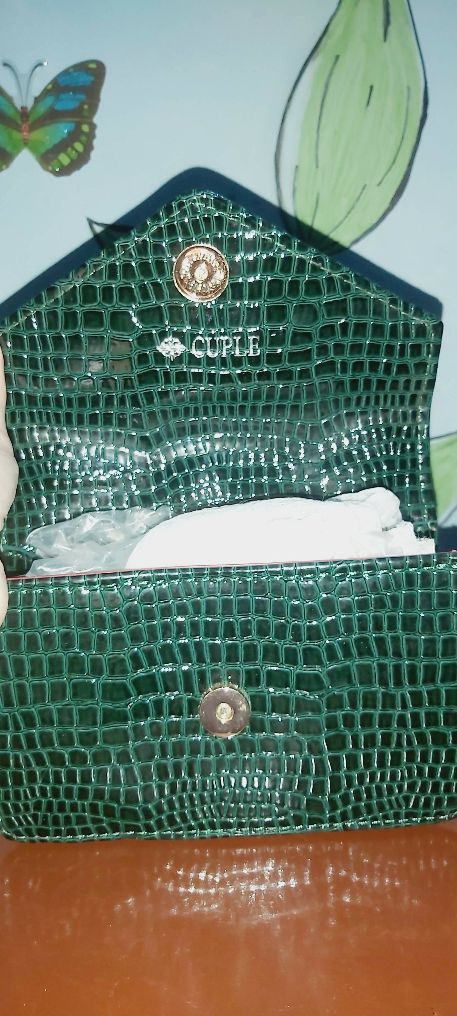 | MATERIAL & MEASUREMENT | Shiny textured green small bag with long chain |