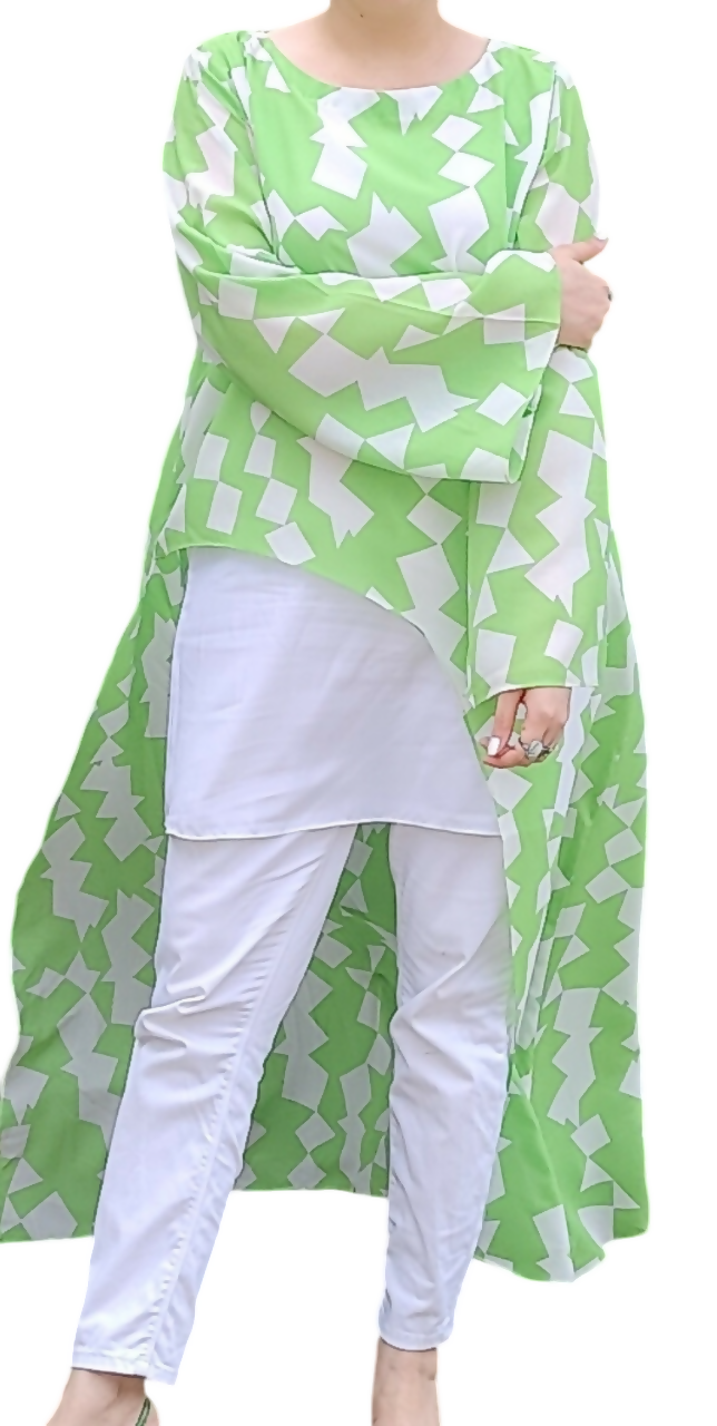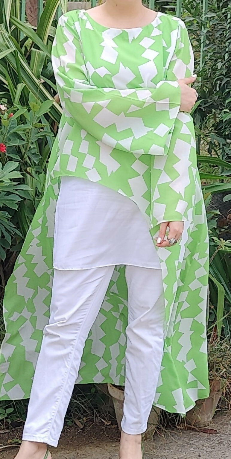 | MATERIAL & MEASUREMENT | Material Georgette Color green and white Length back 55 Length front 32 Chest 22 |
