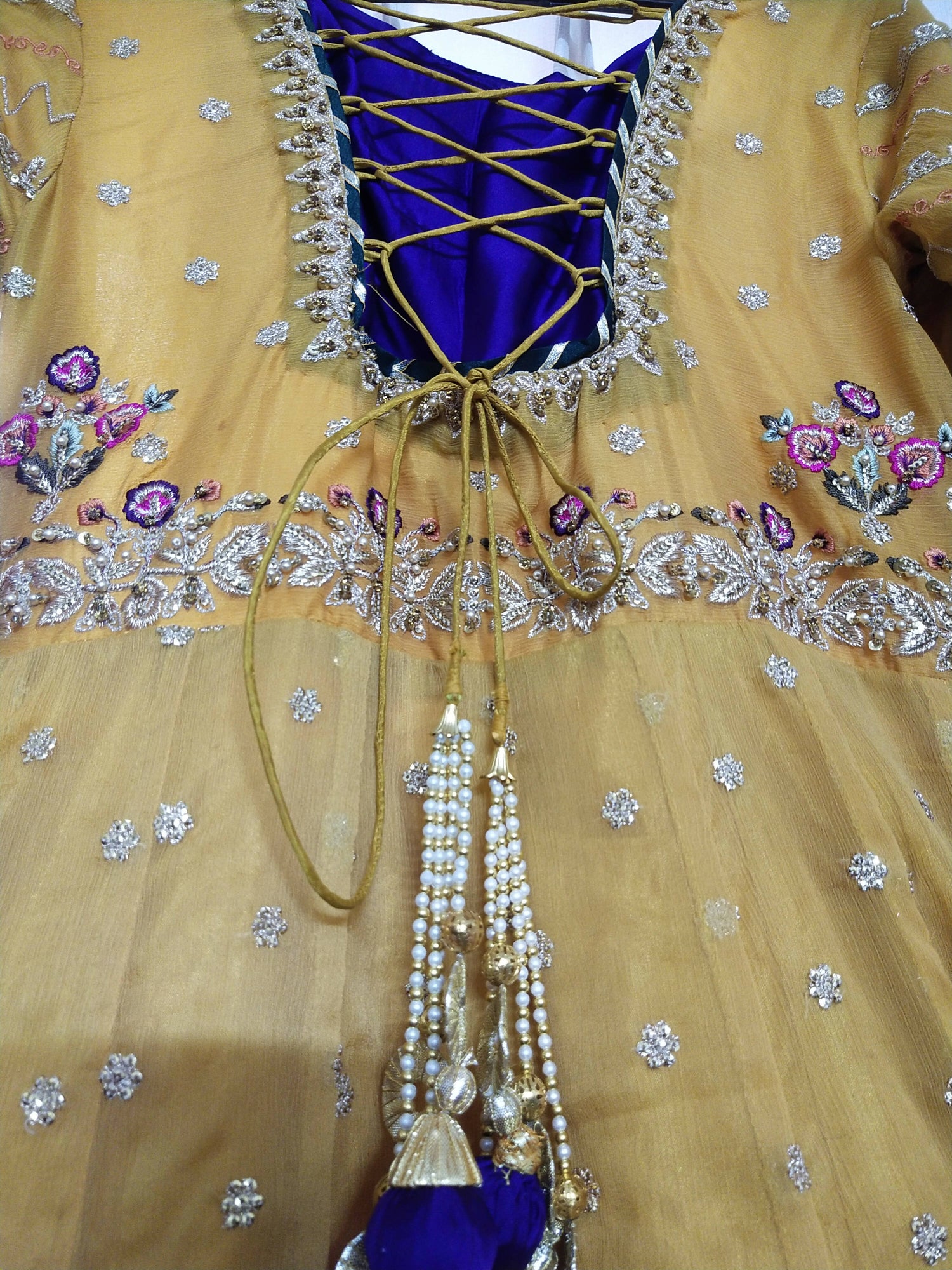 Pure Chiffon maxi gota pearls and stone work on it. Fully emroiderd heavy vide flayer maxi. Can can attach to it & detailing with laces & tussels & hand work on it