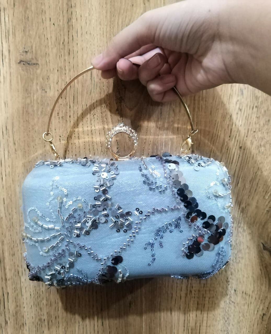 sky blue saree (cut dana) pearls and beads on full saree and blouse.