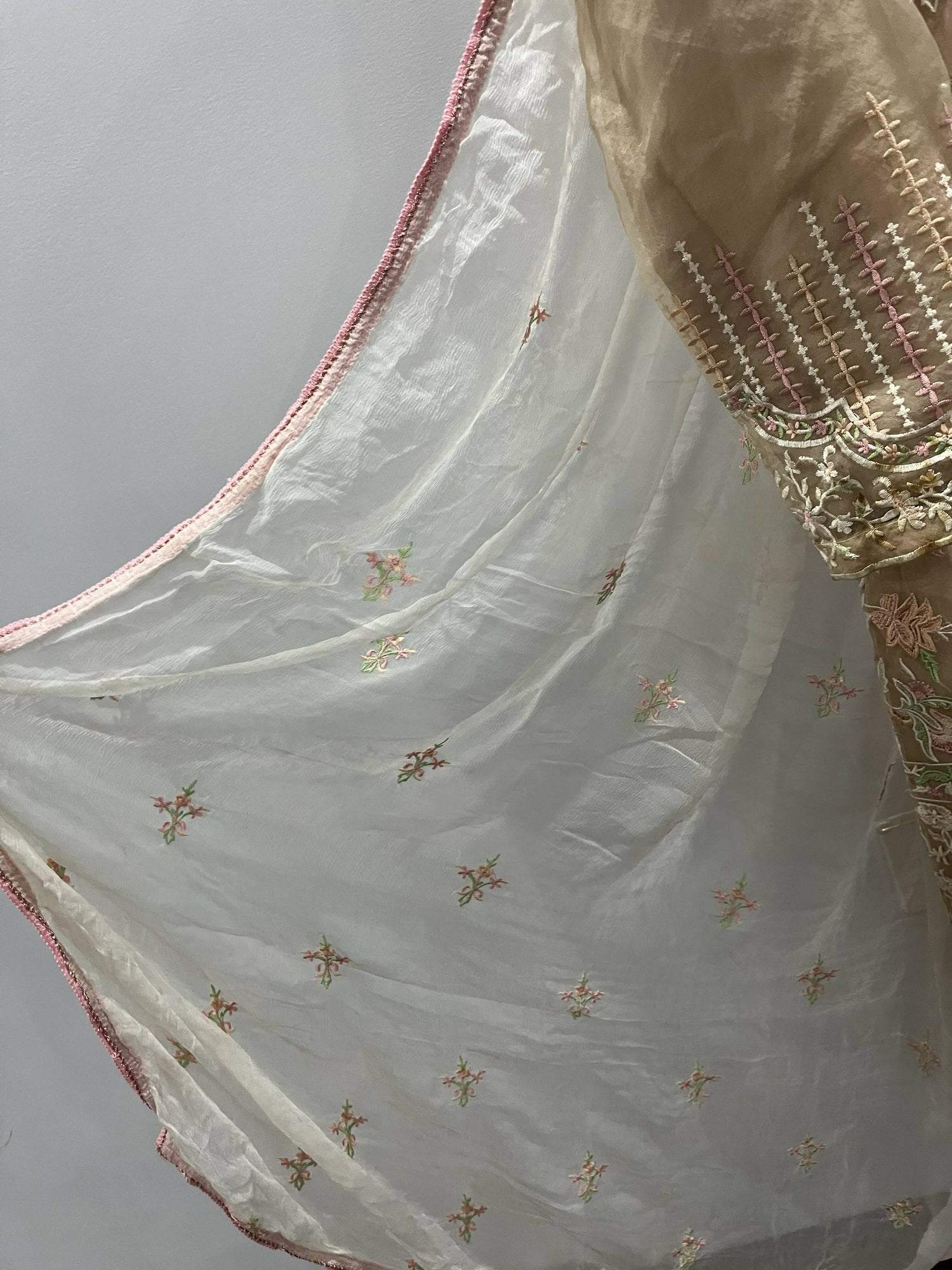 | MATERIAL & MEASUREMENT | Shirt fabric: Net Dupata: Chiffon Trouser: Cambric Chest: 18-19 Length: 37-38 Condition: 8/10 |