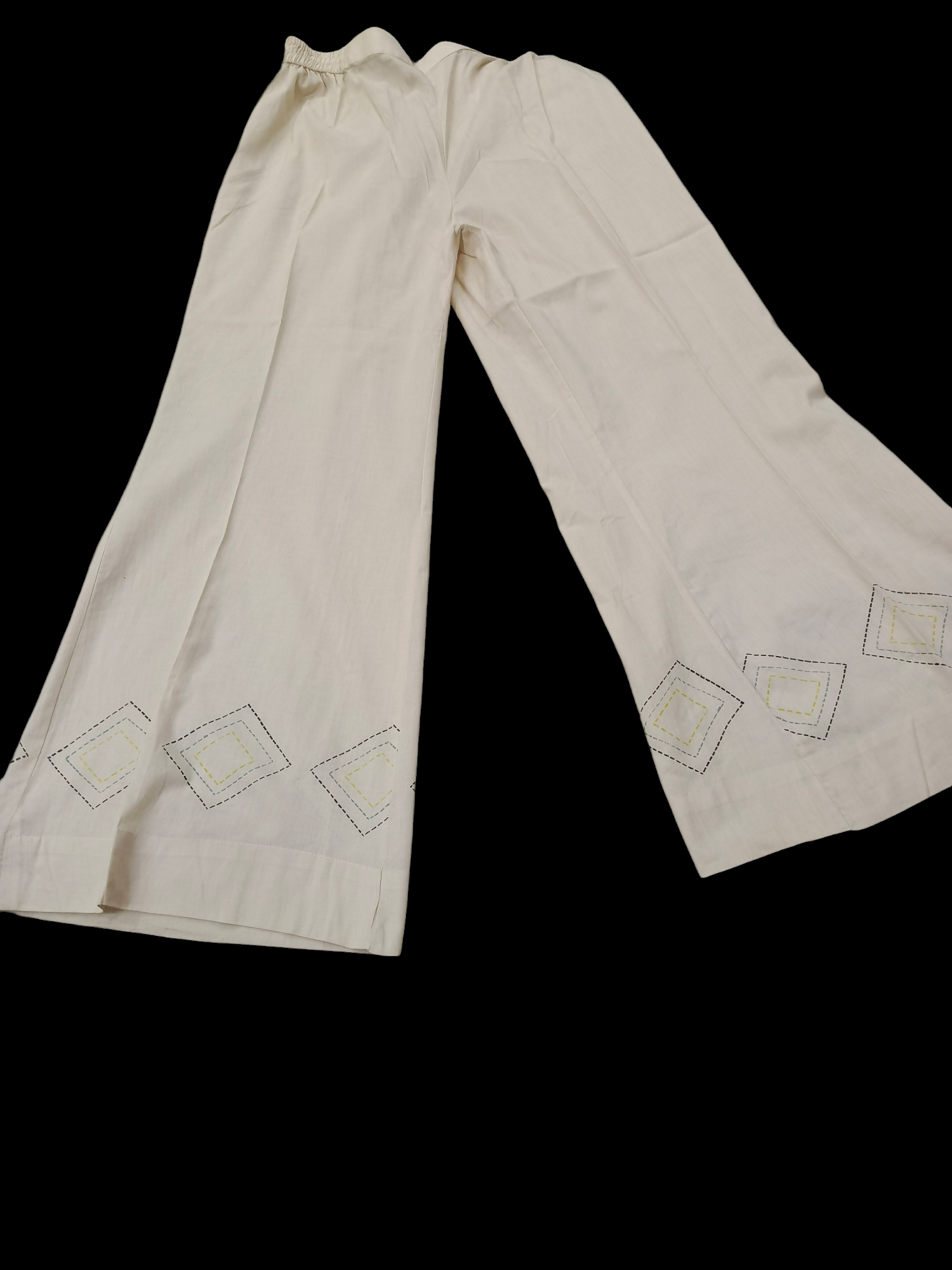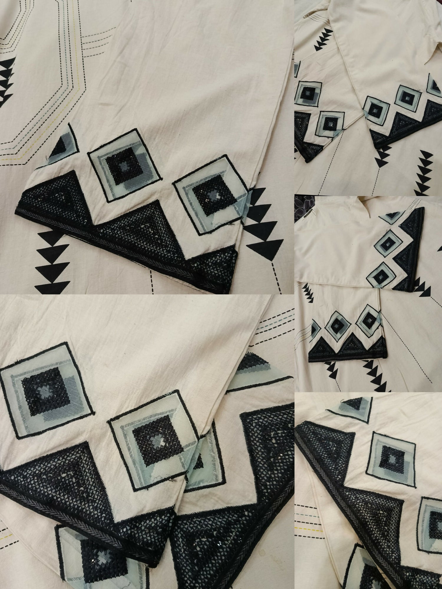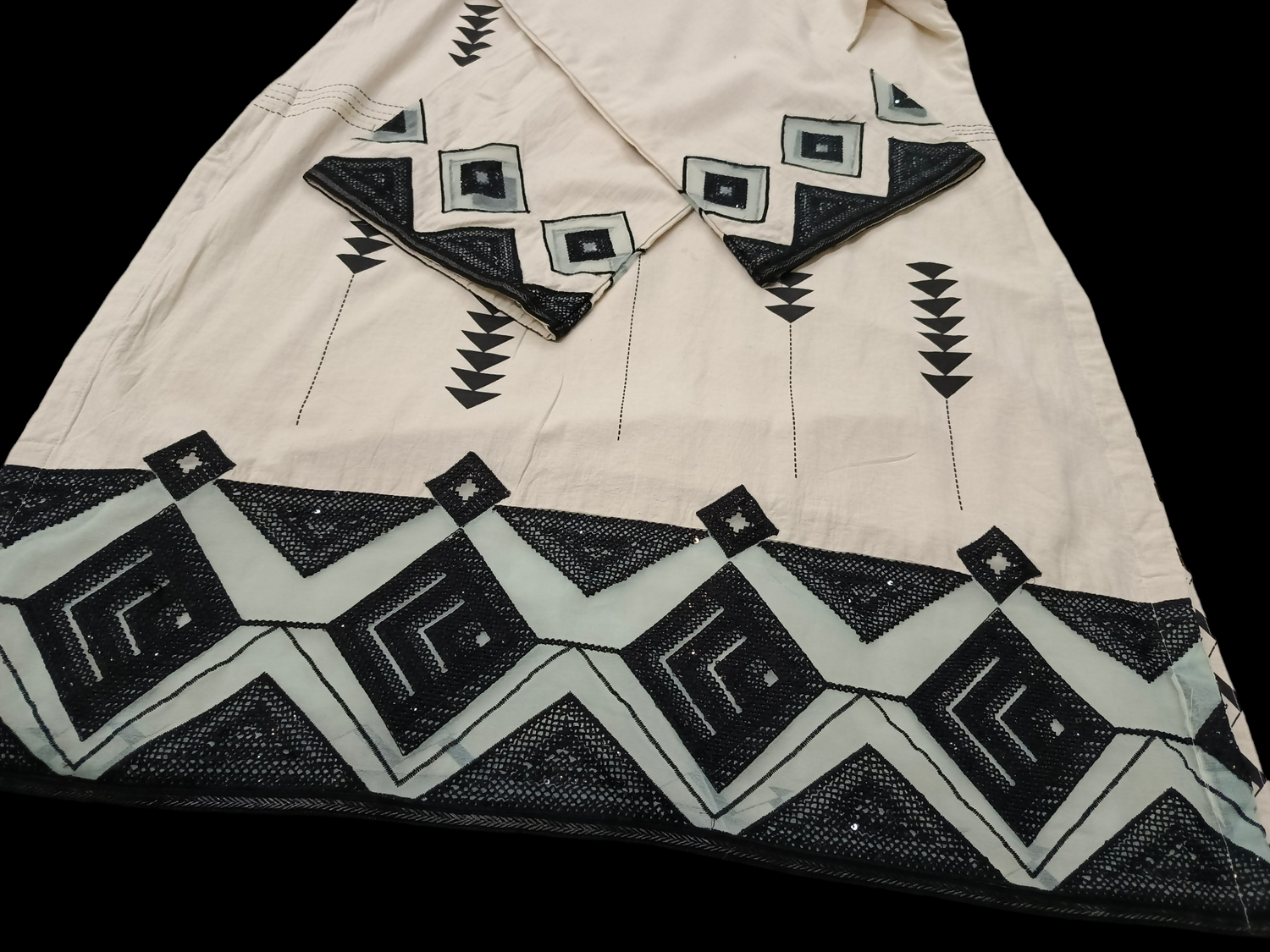 This shirt has interplay of sequins(Sitara)work on Sleeves,border along with skyblue organza patches in contrast that creates a vision of effortless charm.The printed triangular black patterns trimmed with organza patches provides contrast to this cream fabric.The printed trouser adds a glamour and spark to the overall look of this outfit.A beautiful outfit for any formal ocassion such a wedding or a party.It is beautifully embodying a round neckline with loose sleeves and daman.