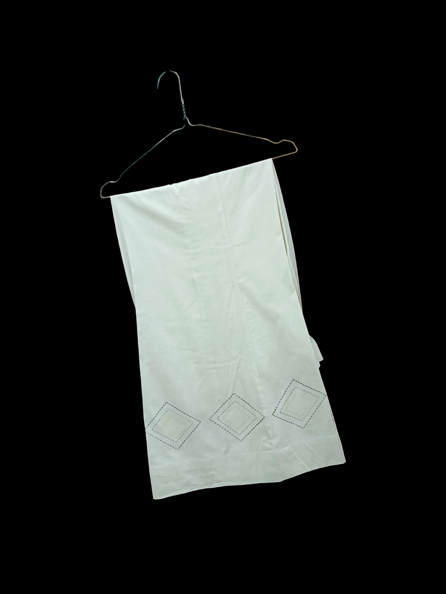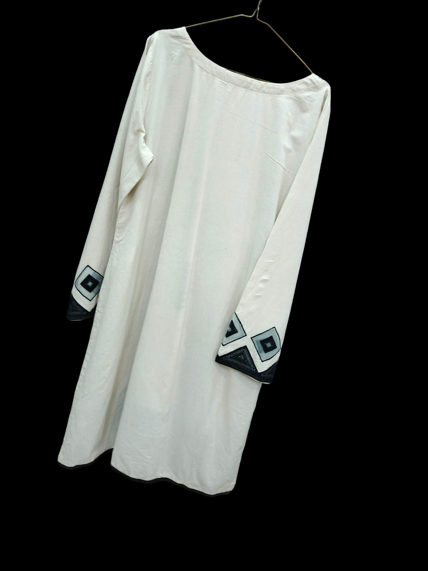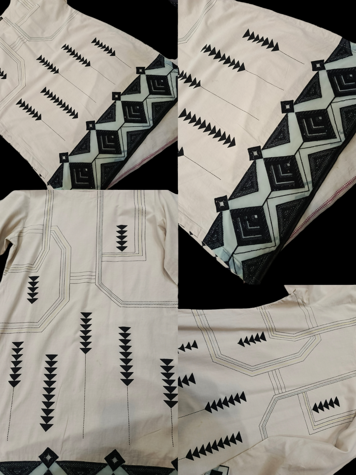 This shirt has interplay of sequins(Sitara)work on Sleeves,border along with skyblue organza patches in contrast that creates a vision of effortless charm.The printed triangular black patterns trimmed with organza patches provides contrast to this cream fabric.The printed trouser adds a glamour and spark to the overall look of this outfit.A beautiful outfit for any formal ocassion such a wedding or a party.It is beautifully embodying a round neckline with loose sleeves and daman.