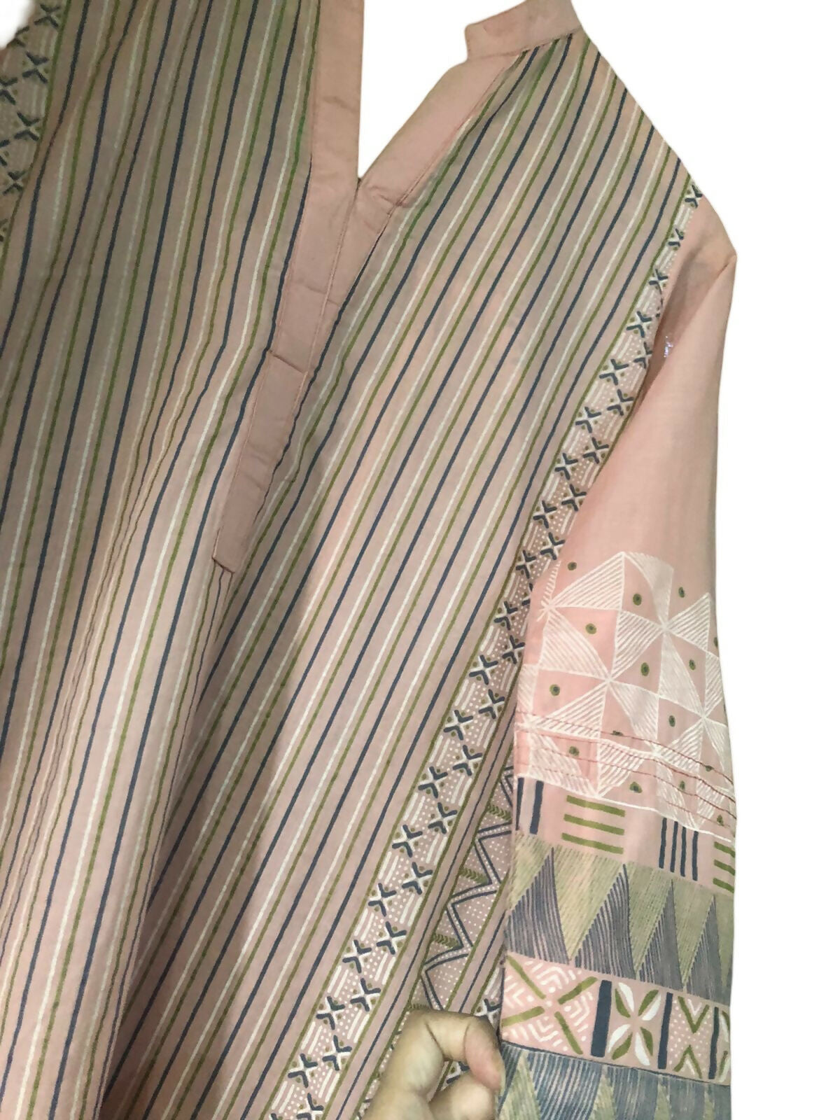 | MATERIAL & MEASUREMENT | Tea pink dress 2 pc feom khaadi unstitched collection self stitched trouser length 35 capri style chest size 19 shirt length 37.5 |