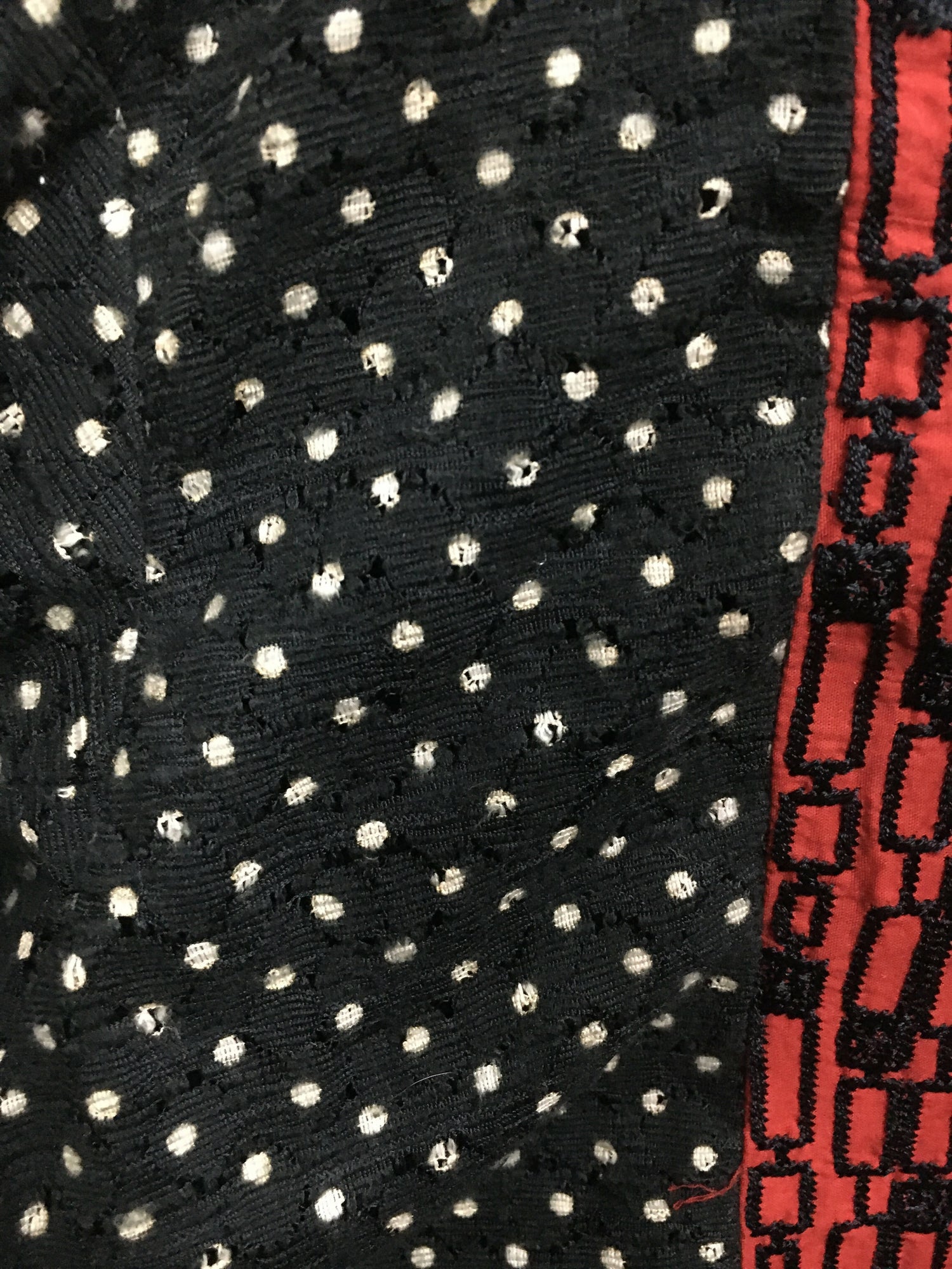 Black and red embroidery with dots