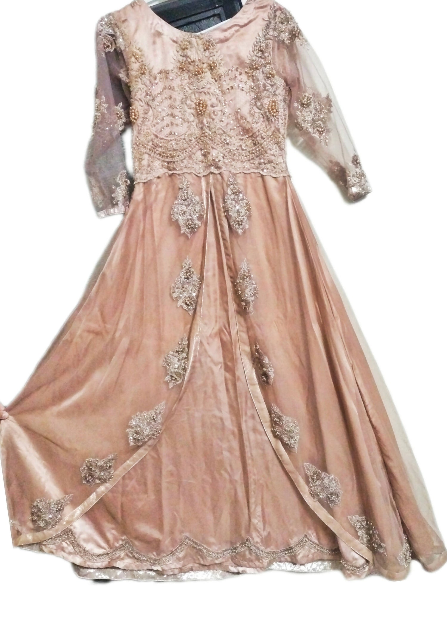 Fabric: Moti work peach colored long maxi frock with simple pajamaSelling price: 2500/-