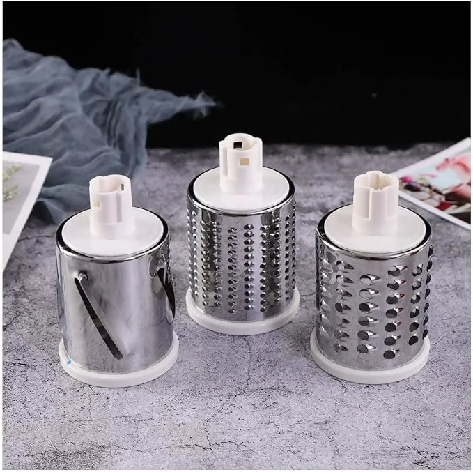 | MATERIAL & MEASUREMENT | Type: Manual Tabletop Drum Cheese Grater Function: 3 in 1 – Slice | Shred | Grind Material: Stainless Steel + Food-Grade ABS Plastic Operation: Hand Crank with Suction Base Cleaning: Detachable & Dishwasher Safe Parts Uses: Cheese, Carrots, Potatoes, Cucumbers, Nuts, Chocolate, Fruits |