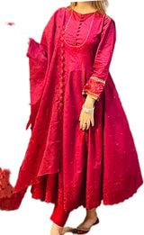 | MATERIAL & MEASUREMENT | 3 piece Kalidar Dress in small size Color:Maroon Embroidered frock Embroidered Net dupatta Plain trouser Small Measurements: Shoulders:13.5 inch Chest:19.5 inch Length:48 inch Condition:9/10 |