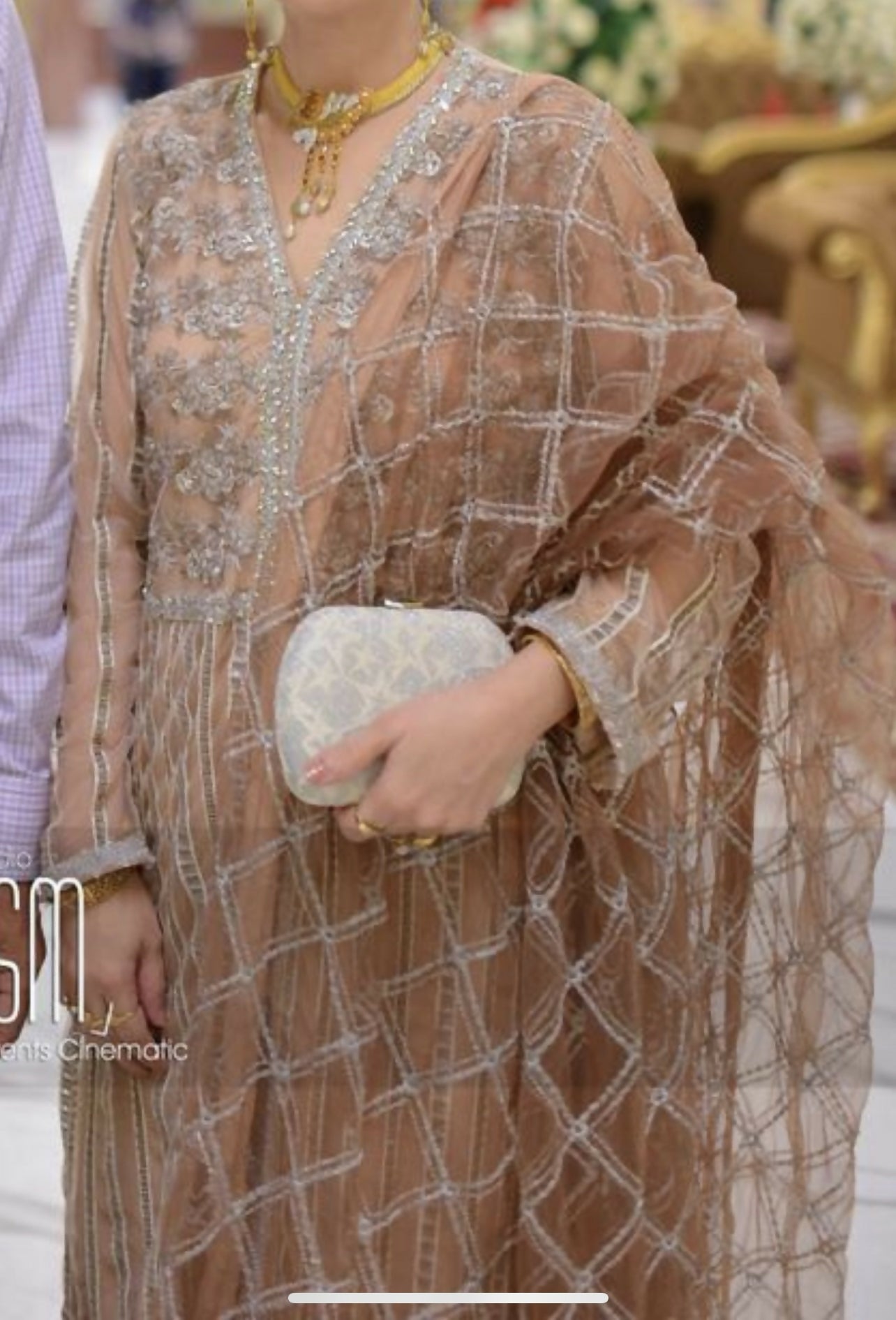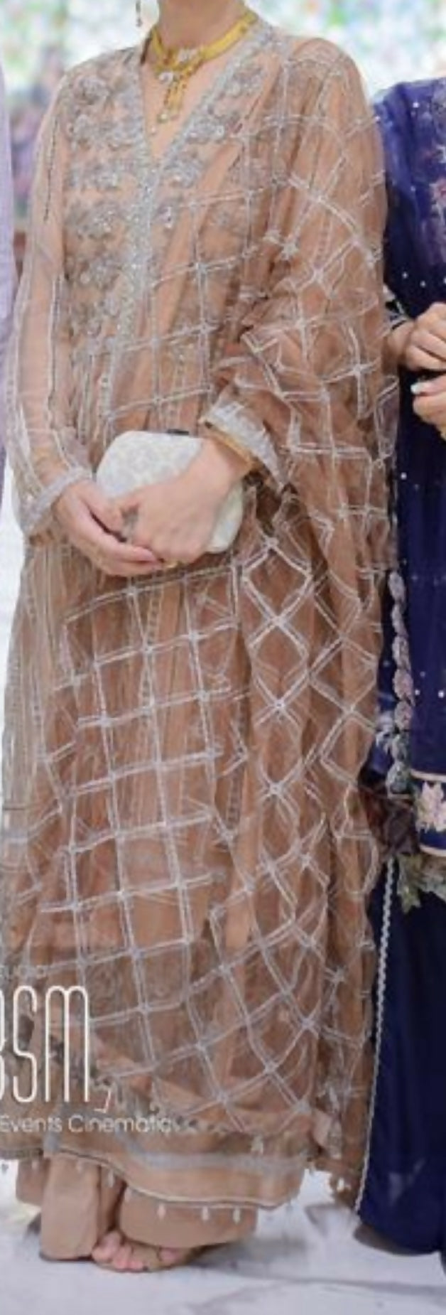 Long maxi (gown type, front chalk open)+ raw silk sharara +net dupatta