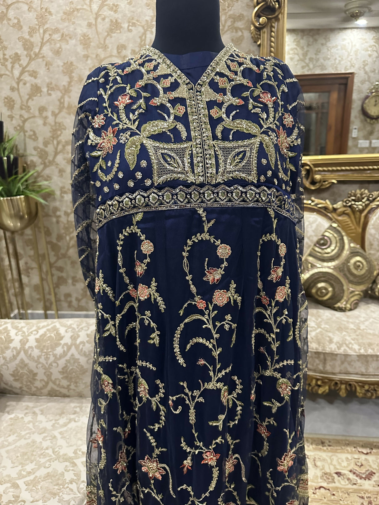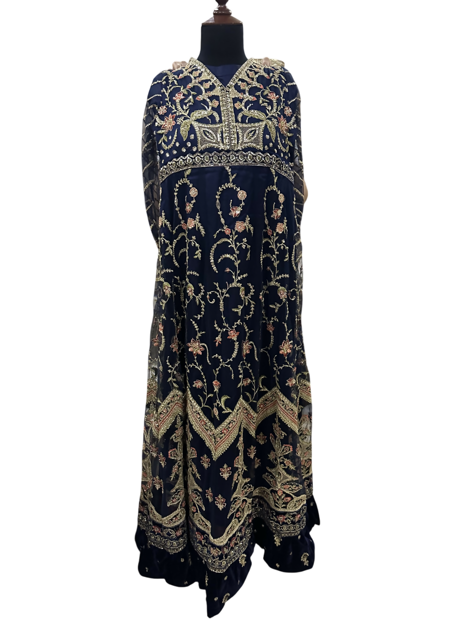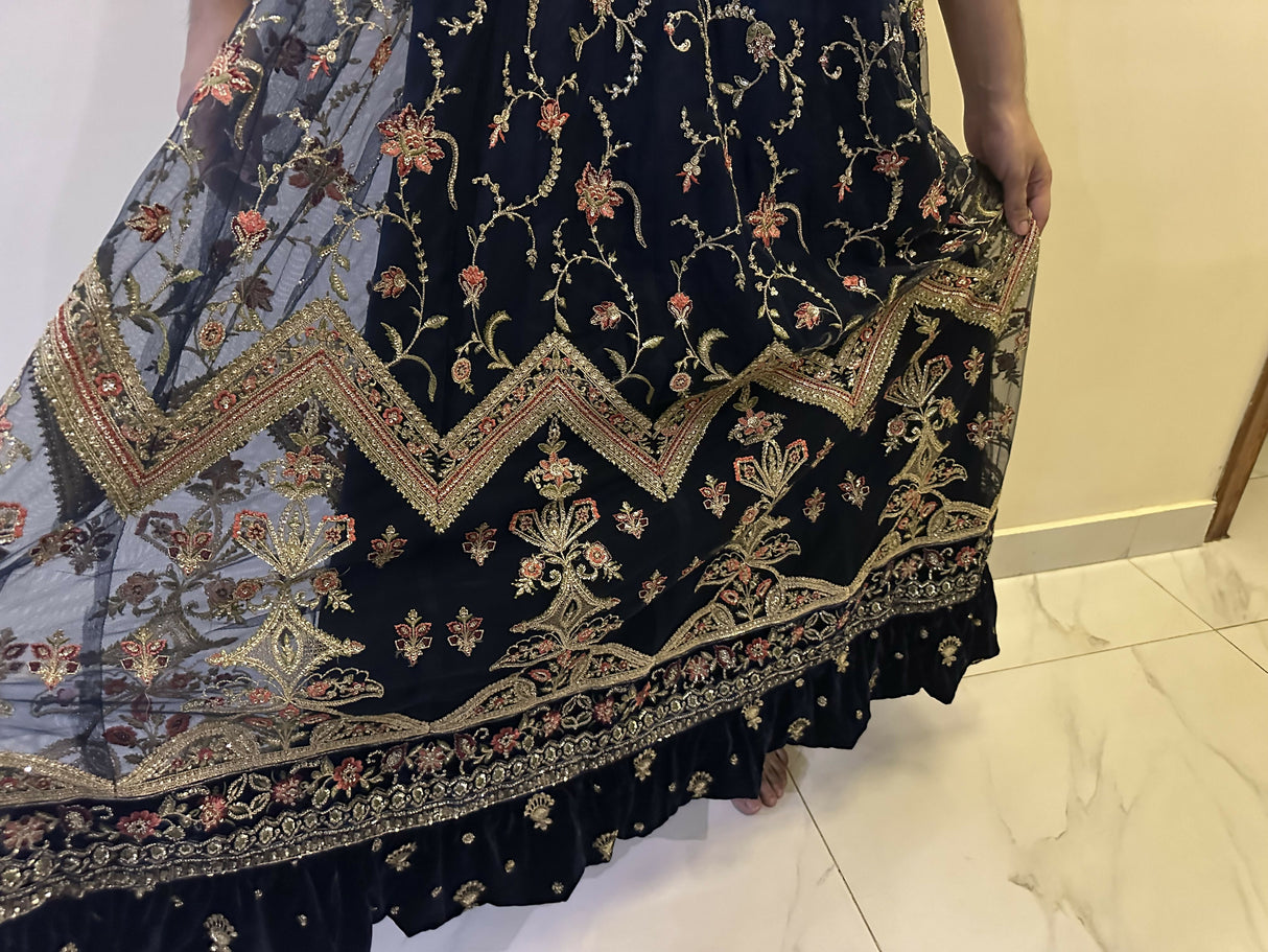 | MATERIAL & MEASUREMENT | Material is good quality net raw silk inner used , embroidery with fine details measurement (inch) Length:58-59 chest: 18 Ghera: 50 |