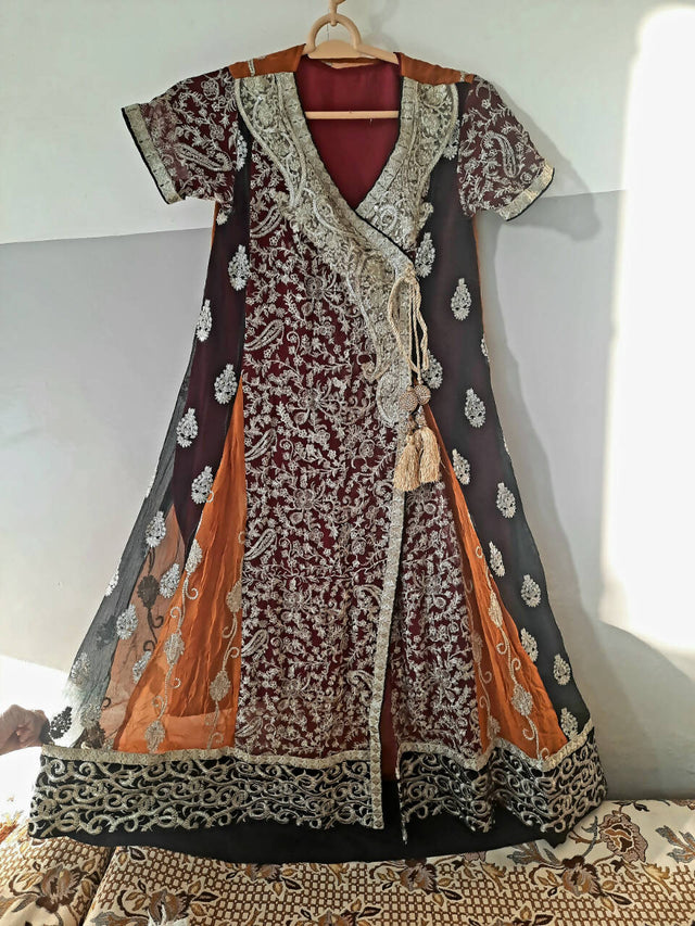 | MATERIAL & MEASUREMENT | Krincle shafoon angrakha Full embroided Size medium Colour mehroon black and orange front and orange back Front 45 inch long Back 52 inch long Cheast 17 inch Half sleeves 6 inch |