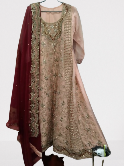 Graceful Peach Barat maxi and maroon dupatta | Women Bridals | Medium | Worn Once is backordered and will ship as soon as it is back in stock.