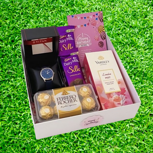 | MATERIAL & MEASUREMENT | Watch: Stainless steel band, 40mm dial, water-resistant Perfume: 100ml, glass bottle with a sleek, modern design Chocolates: 150g box of assorted premium dark and milk chocolates Gift Box: High-quality cardboard with a velvet lining, dimensions: 10" x 8" x 4" |