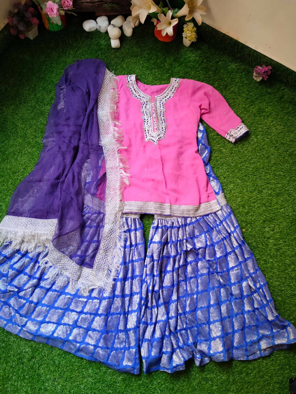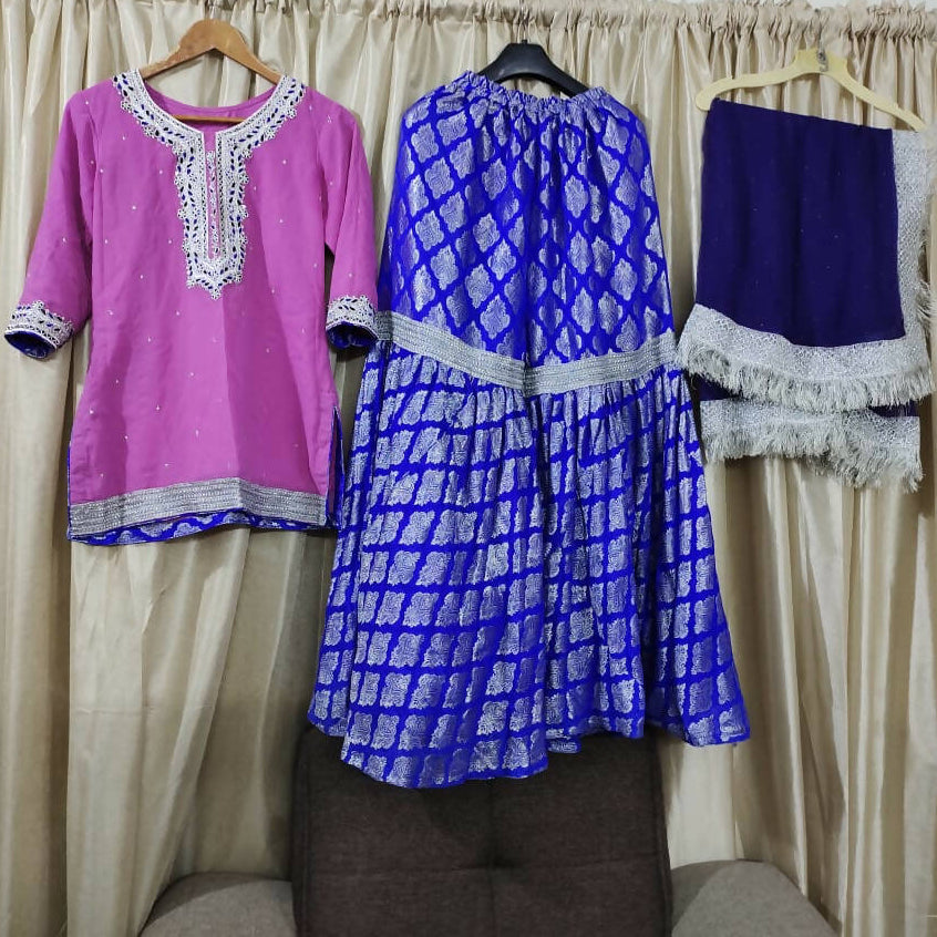 | MATERIAL & MEASUREMENT | Measurements: Gharara length 46.5 inches Shirt size: Bust 38 inches Sleeves 15.5 inches Length 28.5 inches Fabric / Material: Banarsi gharara |