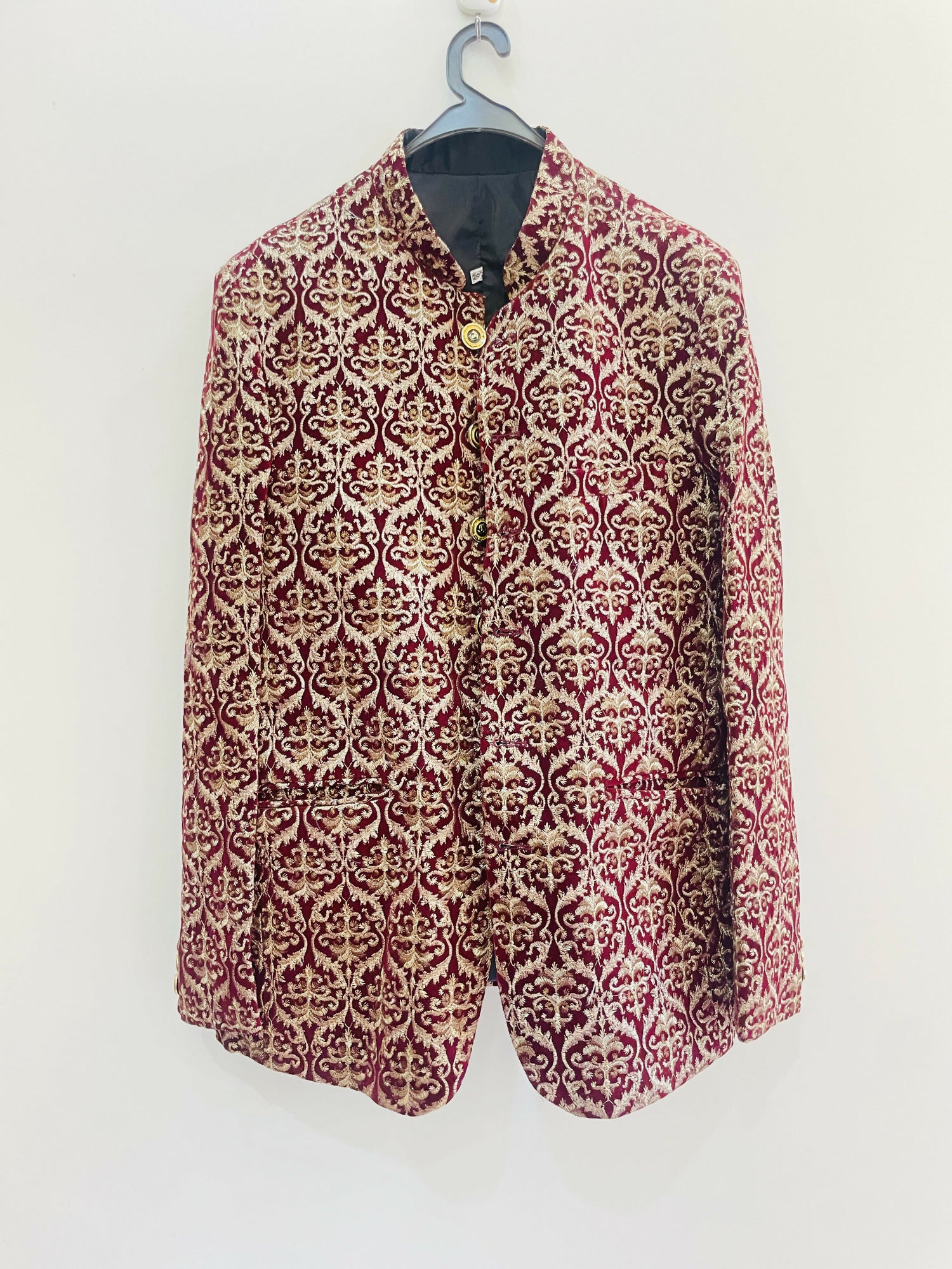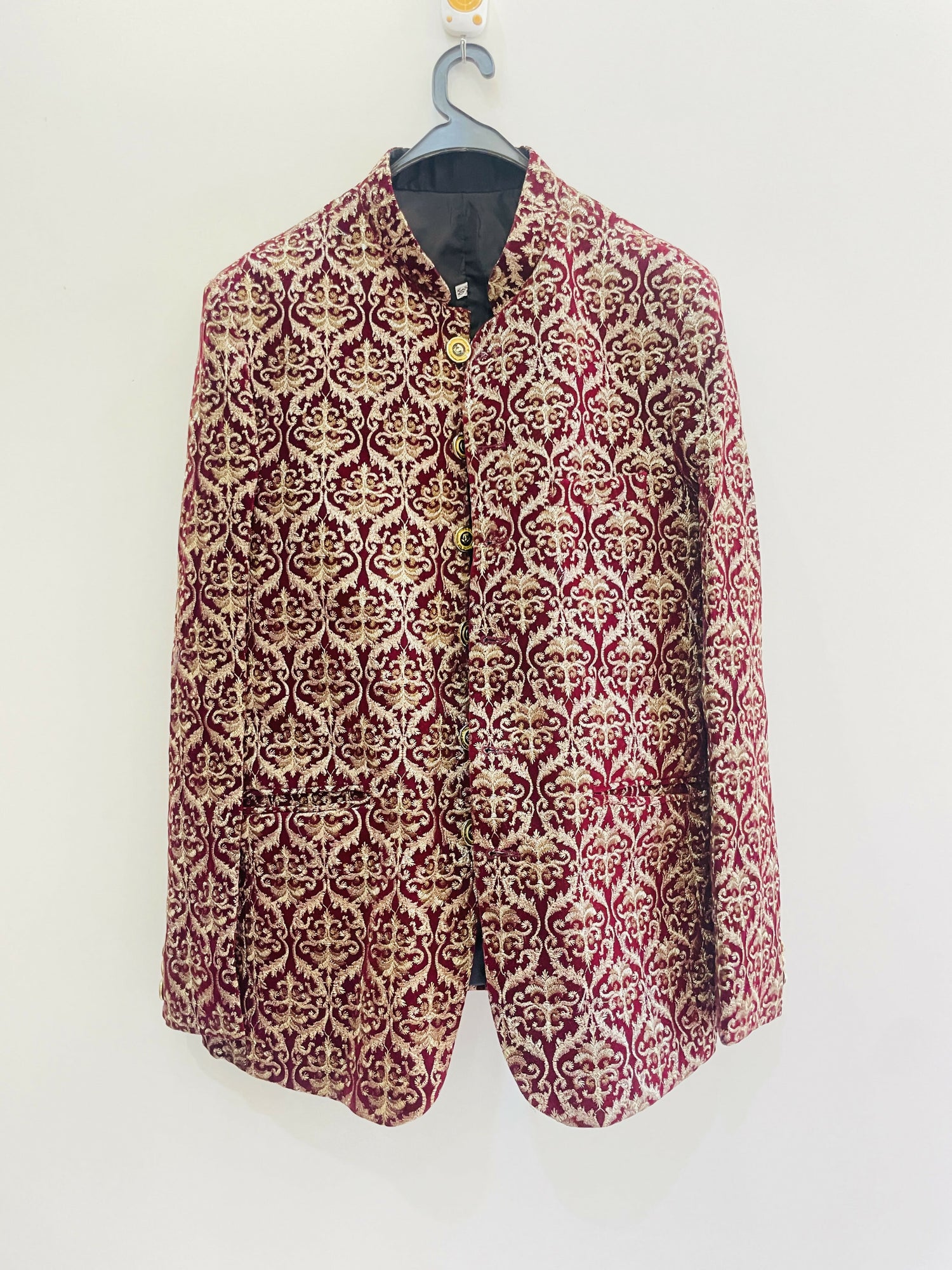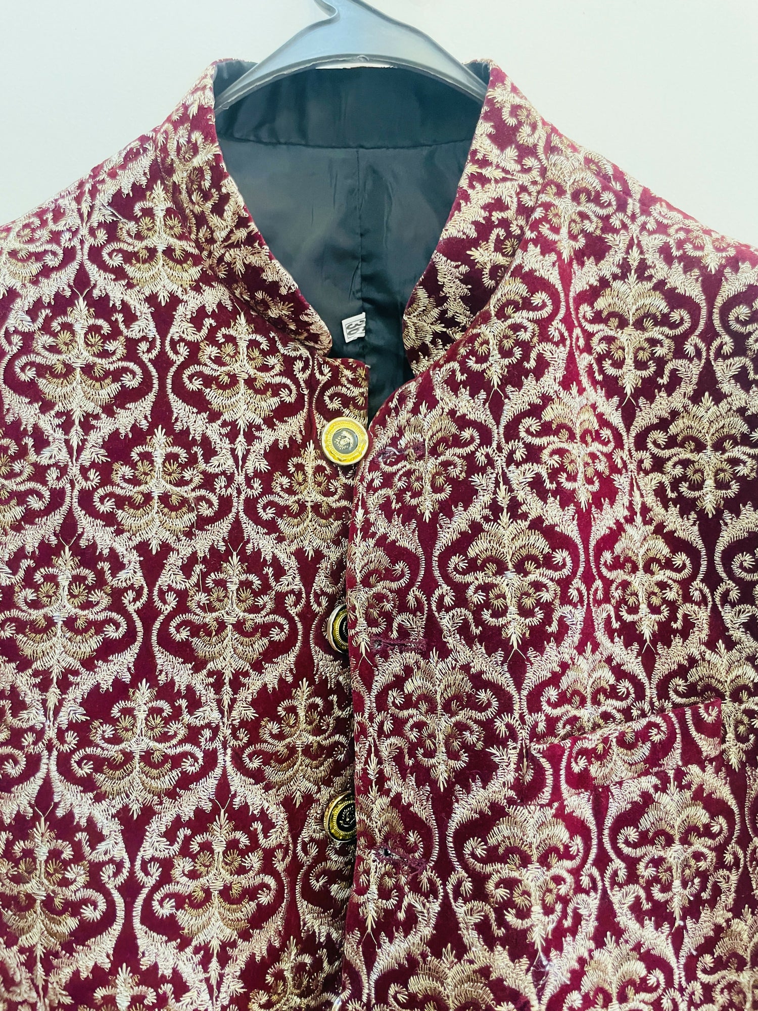 | MATERIAL & MEASUREMENT | Jamawar Embroidered prince coat Small to Medium Color: Maroon Size: 36 |