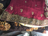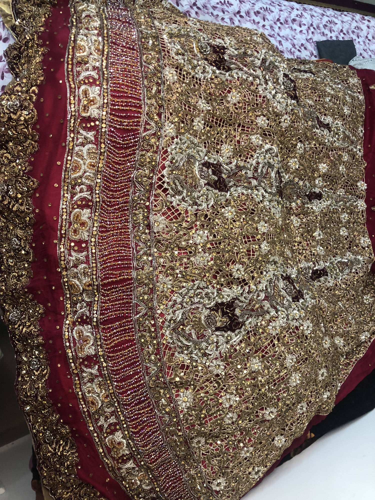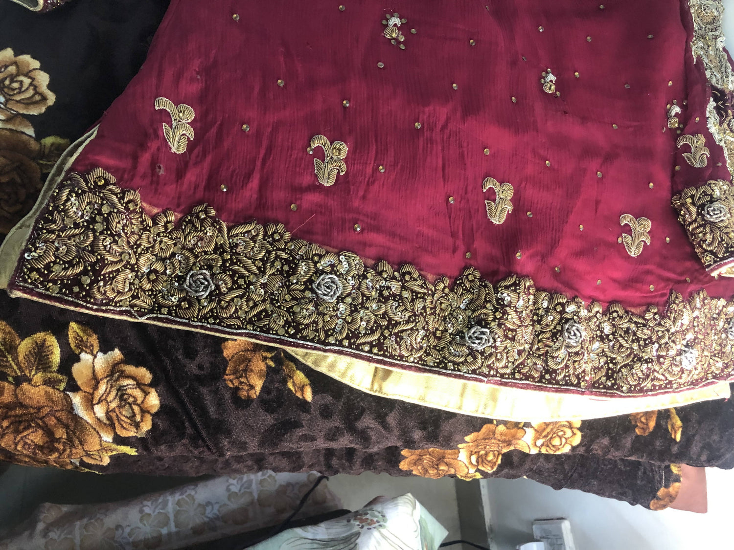 MATERIAL & MEASUREMENT Material: chiffon with heavy kam No of pieces: 3 Size: Medium Measurements lehnga length:42 shirt length:24 shoulder:7 chest:19 Daman:20 original price:1 lakh 10 thousand sale price:90 thousand defect: duppata k nag thore utre hai wore once lehnga shirt conditio:10/10 dupatta condition:9/10