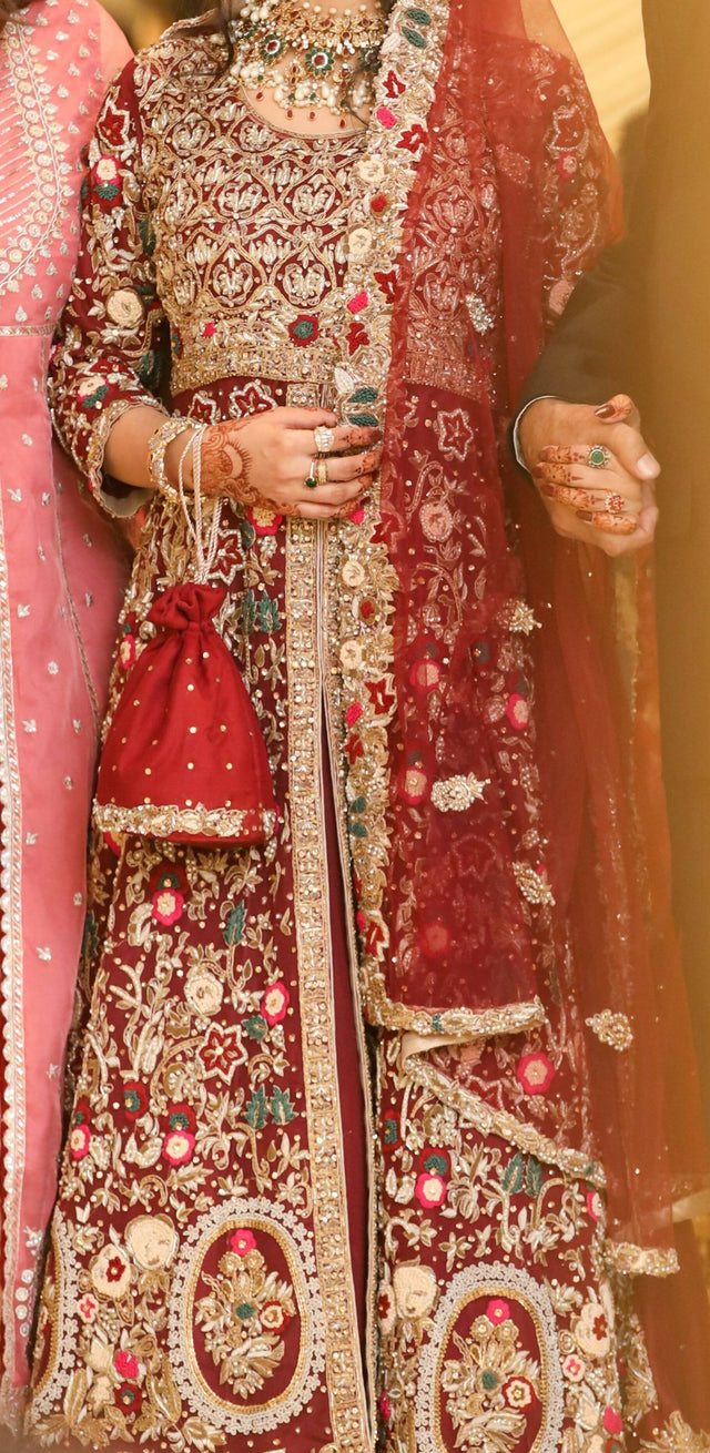MAROON BRIDAL LEHNGA WITH DIMENTIES, STONE, PEARL, THREAD WORK ON IT.