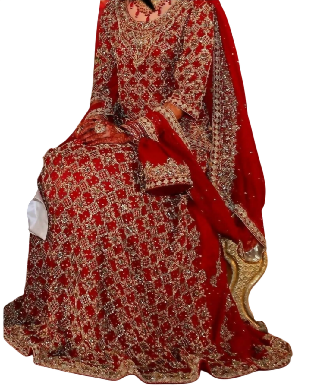 | MATERIAL & MEASUREMENT | Red Shuffon fully embroidered lehnga Size Small to Medium Measurements shirt length 21.5 Sleeves 14.5 Chest 18.5 Waist 17 Front lehnga length 45 Back tail 58 |