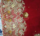 Color: Anari Red Lehnga, Shirt, Duppata and pouch. Fabric: Net Embroidery: Dull golden work with pearls.