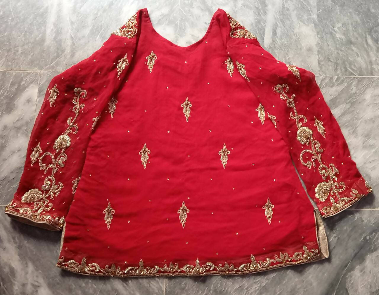 | MATERIAL & MEASUREMENT | Heavy zari work Shirt length 23 Sleeve length 17 chest & Qamar 18 lehnga length 41 lehnga fitting 16 |