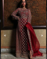 Description: It’s a complete four-piece stitched outfit including a shirt, slip, trouser, and dupatta. It has all machine embroidered base with gold tilla and has hand embellishment work on it on front and sleeves. It is closed from sides and has fronts slits. It is paired with organza dupatta which is stitched with gold border on all four sides.