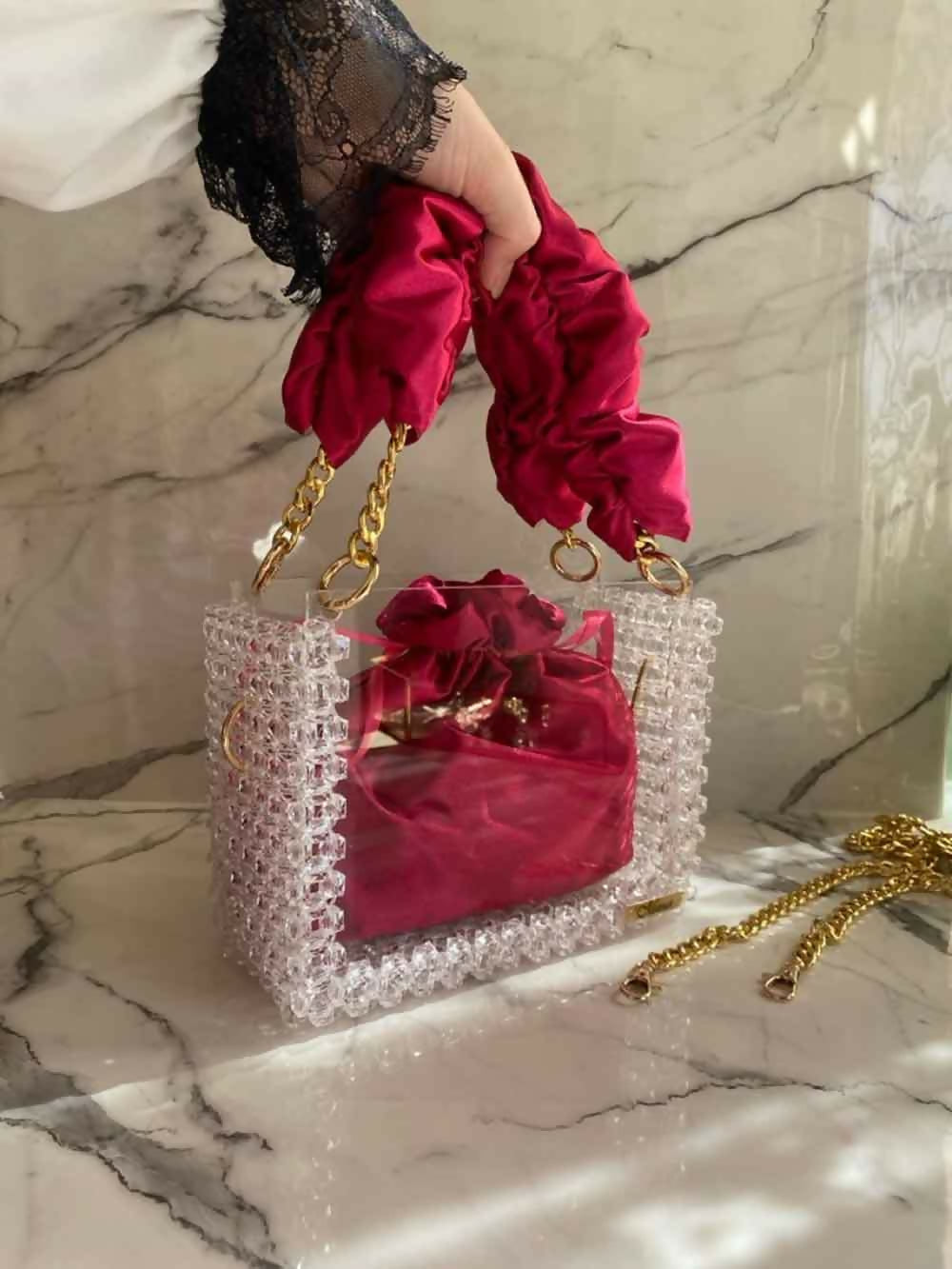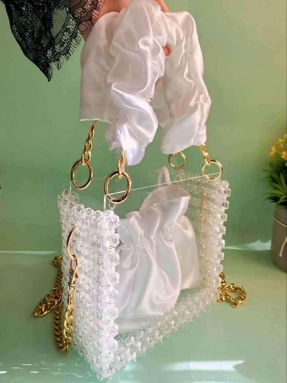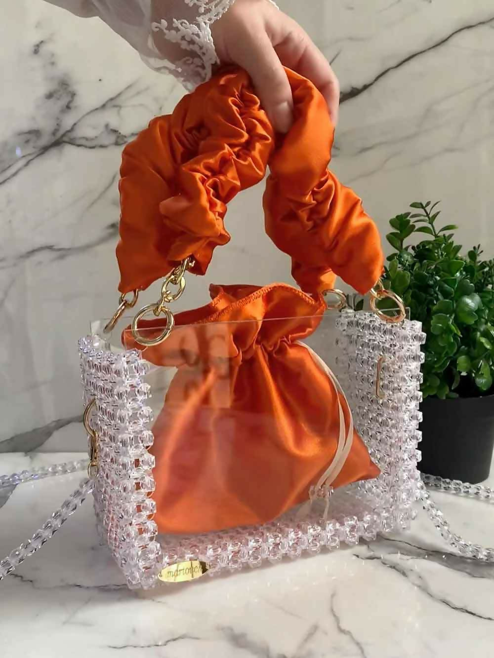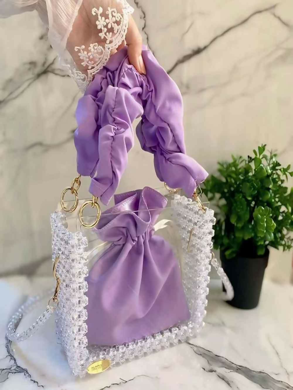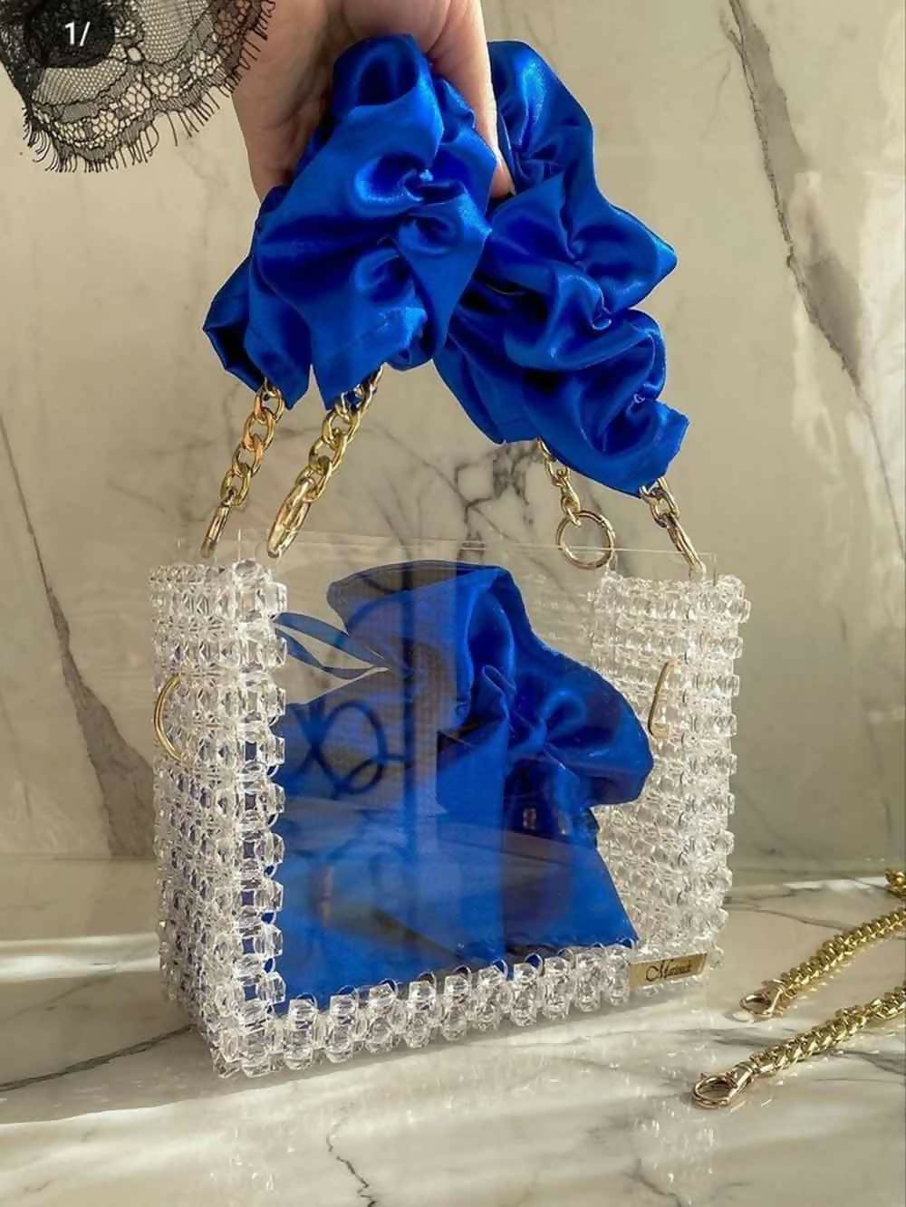 This dazzling “Royal Crystal Pouch Bag” is a blend of luxury and modern craftsmanship. The bag features intricate clear beadwork that forms a sturdy, transparent exterior, accentuated by golden hardware for a touch of opulence. Inside, a striking royal blue satin drawstring pouch offers a pop of color and secure storage for your essentials. Perfect for special occasions or evening outings, this bag is a statement piece that embodies sophistication and contemporary style. Carry elegance with every step!