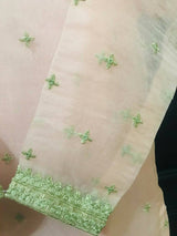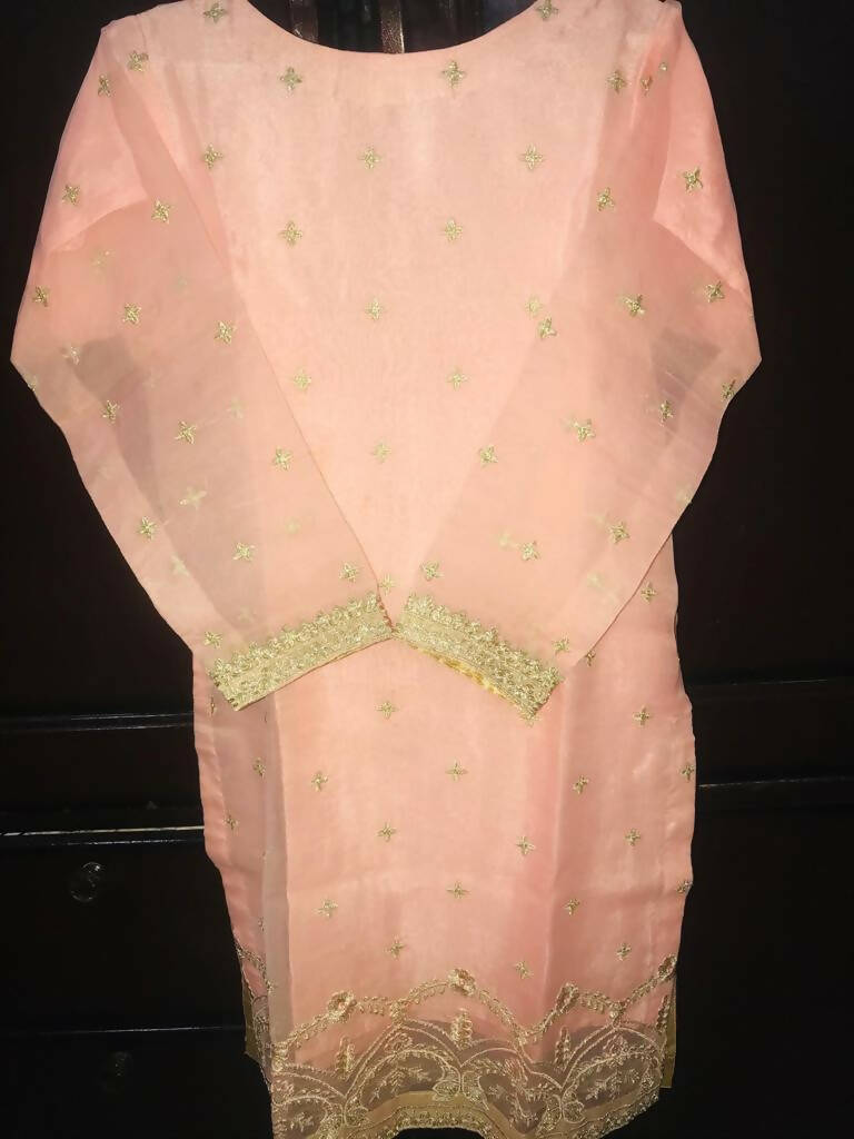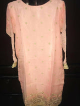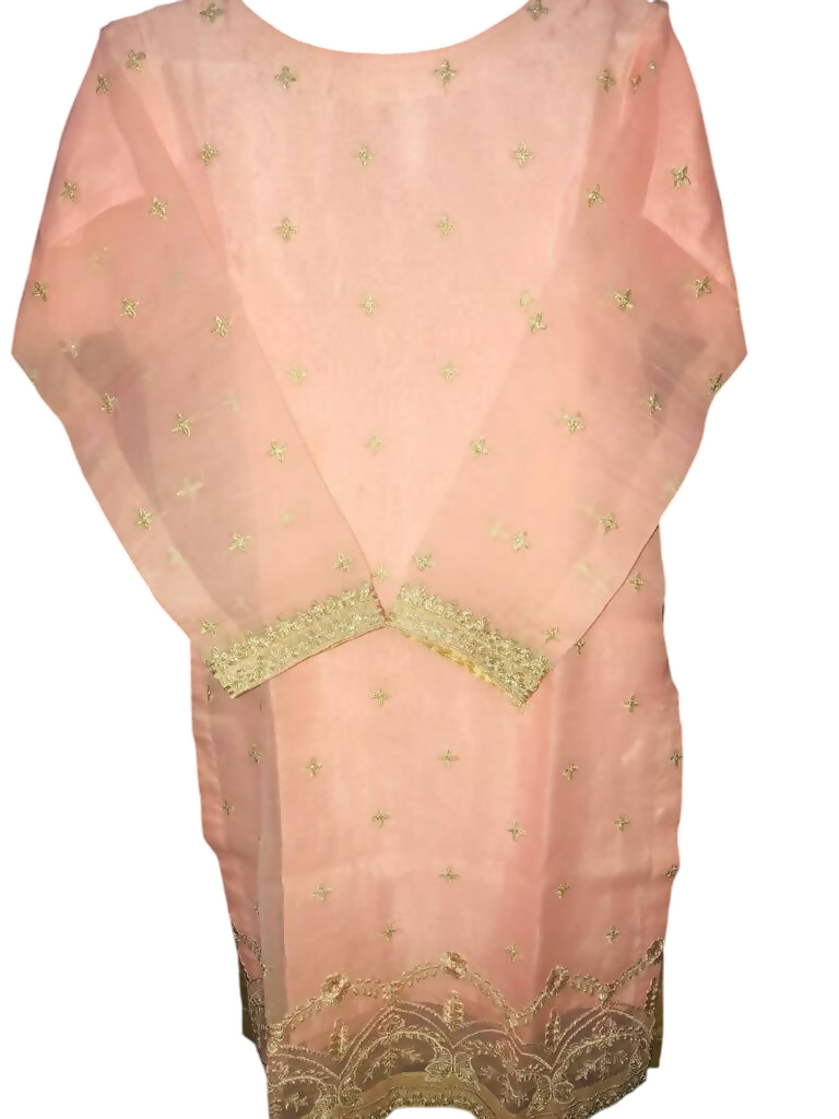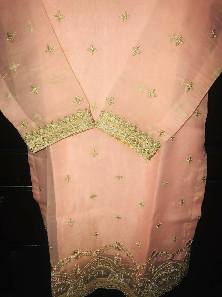 MATERIAL & MEASUREMENT Organza masoori Size Small. Measurements: Chest : 19 inches Length: 34 inches Shoulder: 14 inches Trouser length: 35 inches Fabric / Material: Masoori