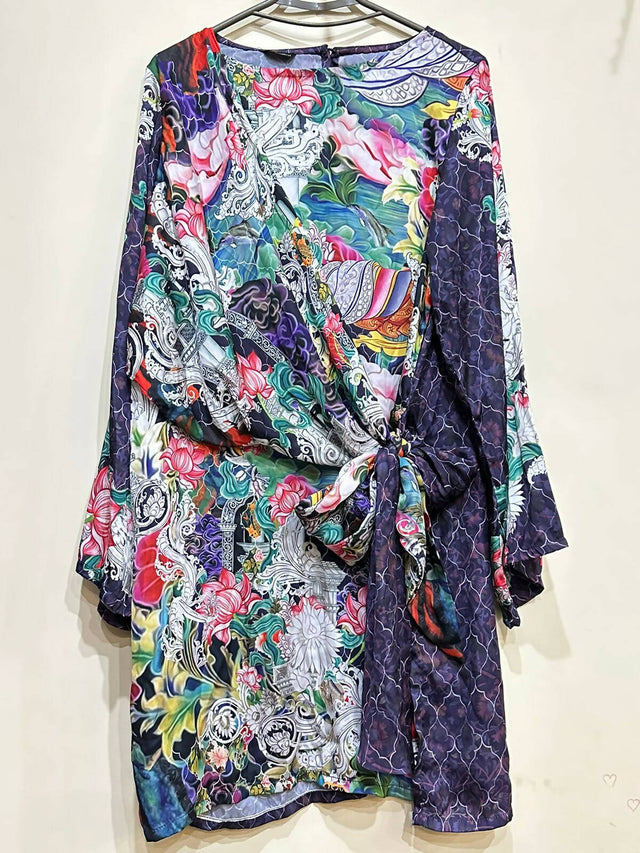 Sapphire silk printed top. It is purple at its base colour and multi-coloured print. It has a bow knitting style at its front.Extra Information