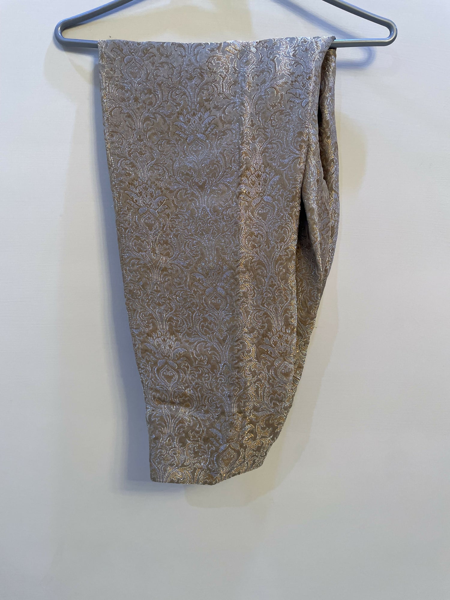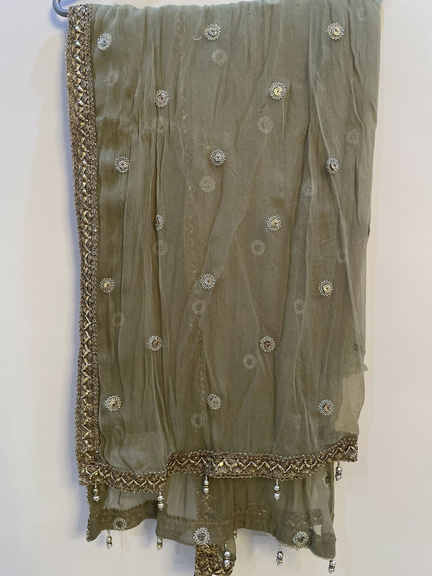 | MATERIAL & MEASUREMENT | Peplum: Paper Katan Dupatta: Chiffon Trouser: Jamawar Measurements: Size: Medium Peplum Shoulder: 15 Bust / Chest: 20 Waist: 17 Hips: 21 Sleeves Length: 21 Trouser Trouser Length: 39 |