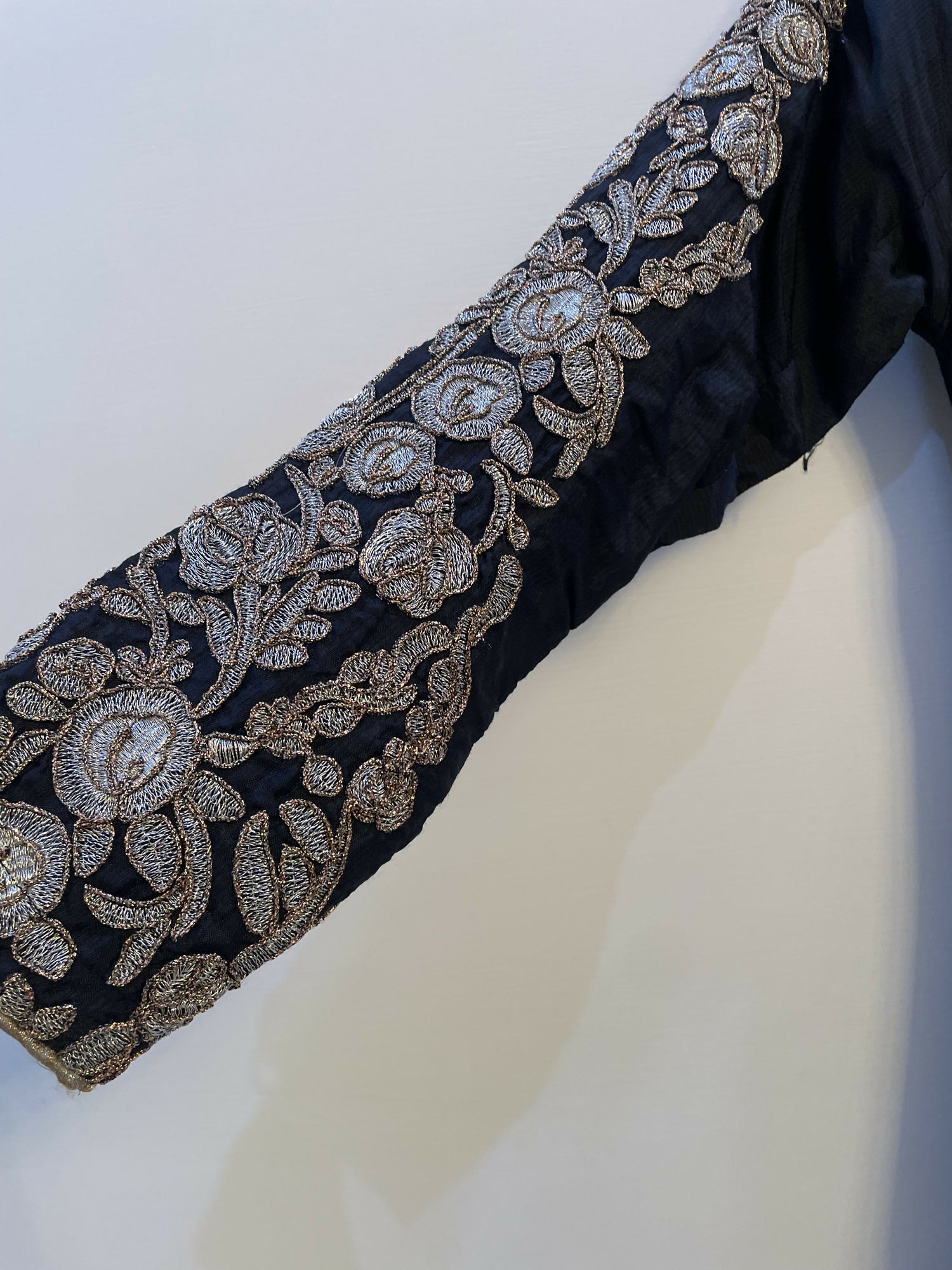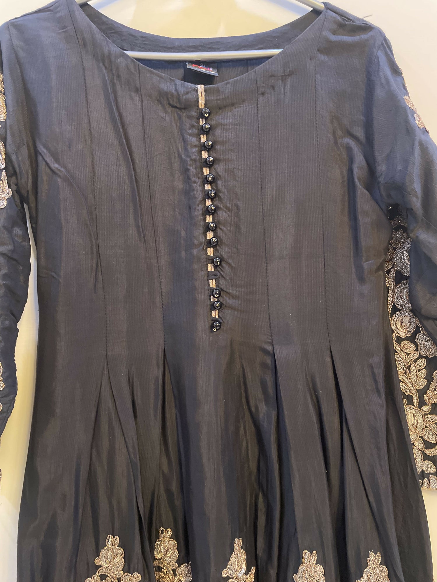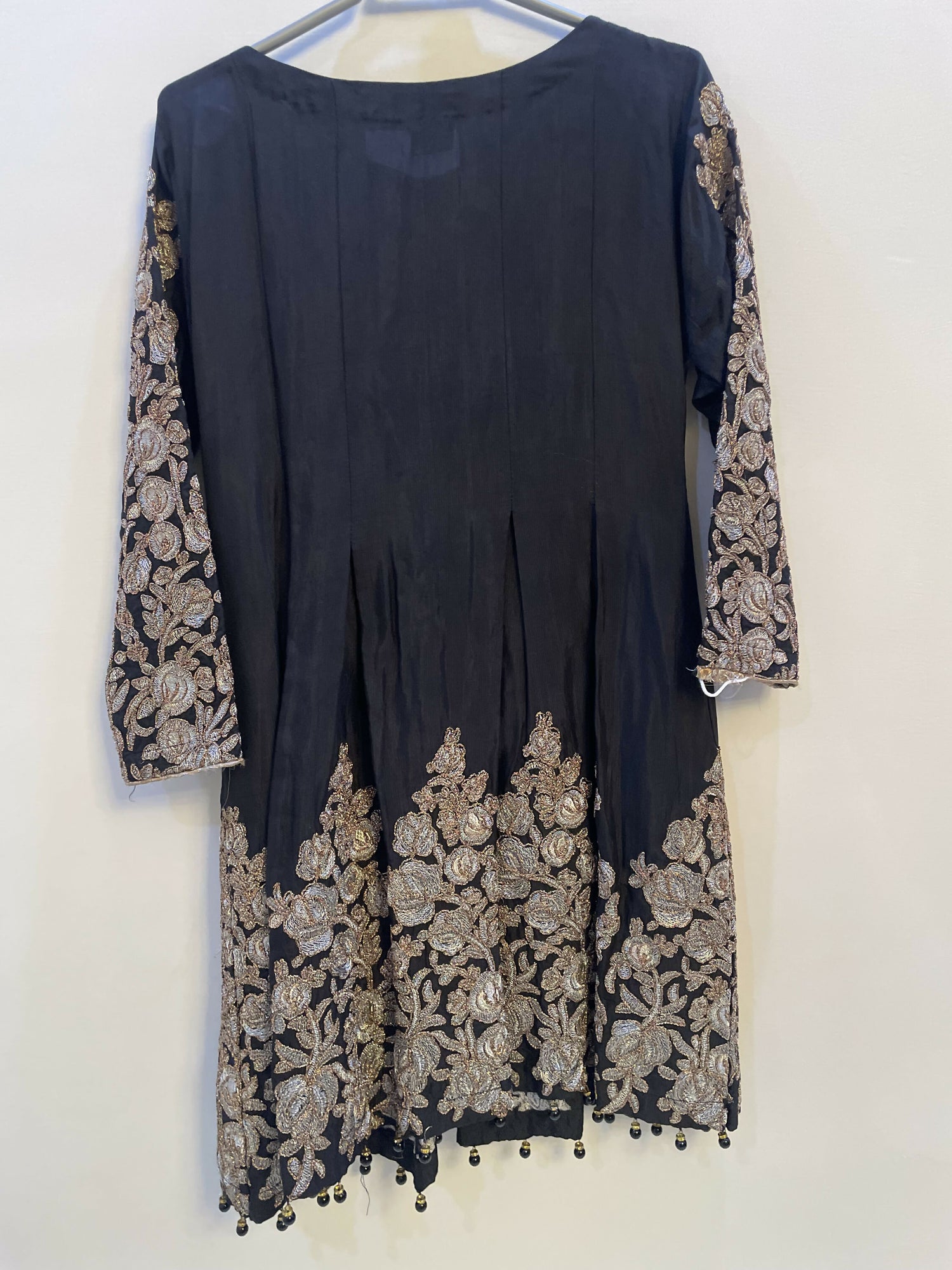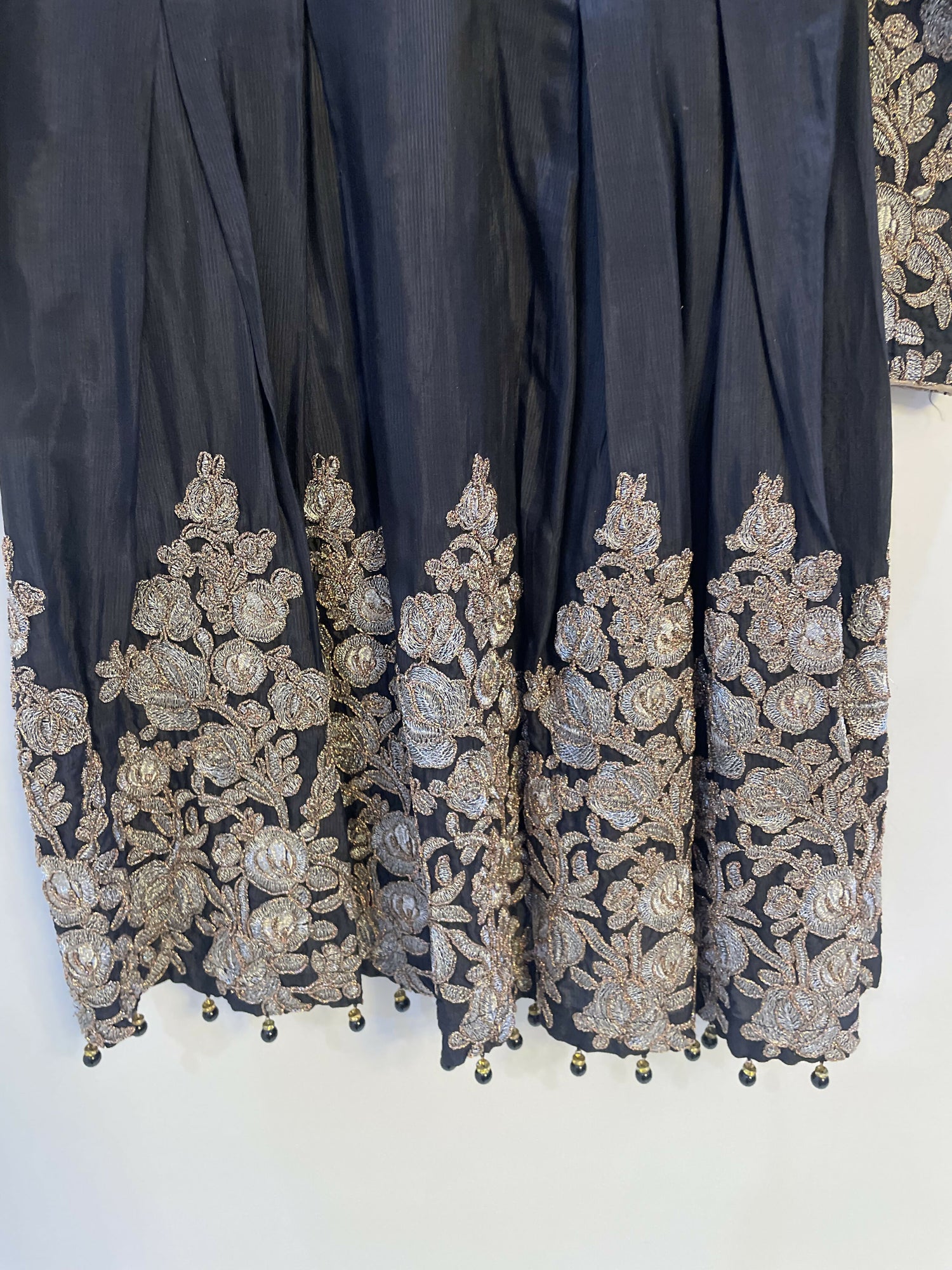 Embrace contemporary elegance with this paper Katan outfit, a short Black, Gold & Copper peplum, showcasing fine handwork, heavy embroidered sleeves and a statement bodice with border detail. Paired with relaxed-fit Jamawar shalwar and a graceful bordered, embroidered chiffonΒ dupatta. ItβsΒ ideal for refined gatherings.