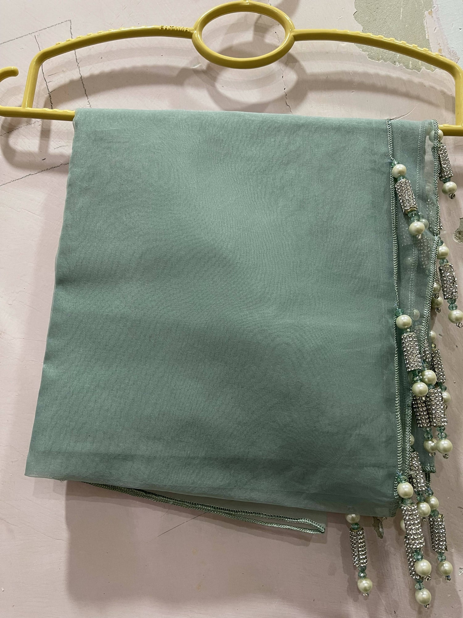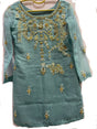 | MATERIAL & MEASUREMENT | Shirt tissue fabric inner silk fabric Trouser silk with net Duppata tissue fabric Duppata plan side se pearl lagwae hai Shirt length 32 Trouser length 39•2 Chest 18 Tummy 16 Bazu 20•5 Arm hole 5 Trouser panche hole 49 |