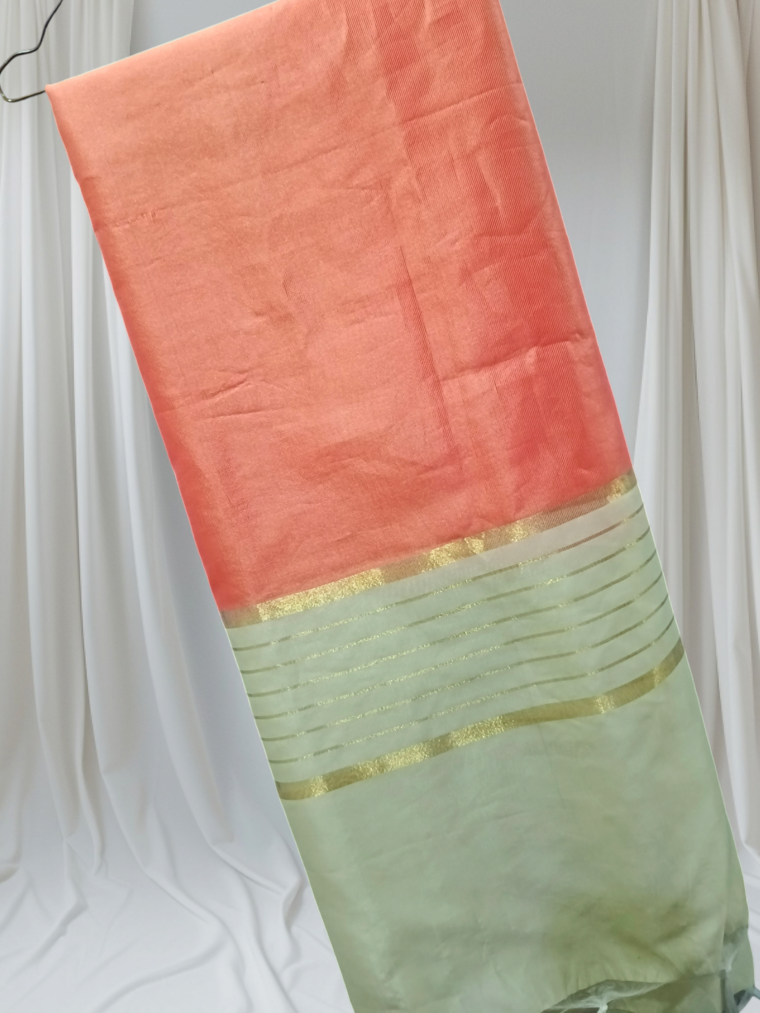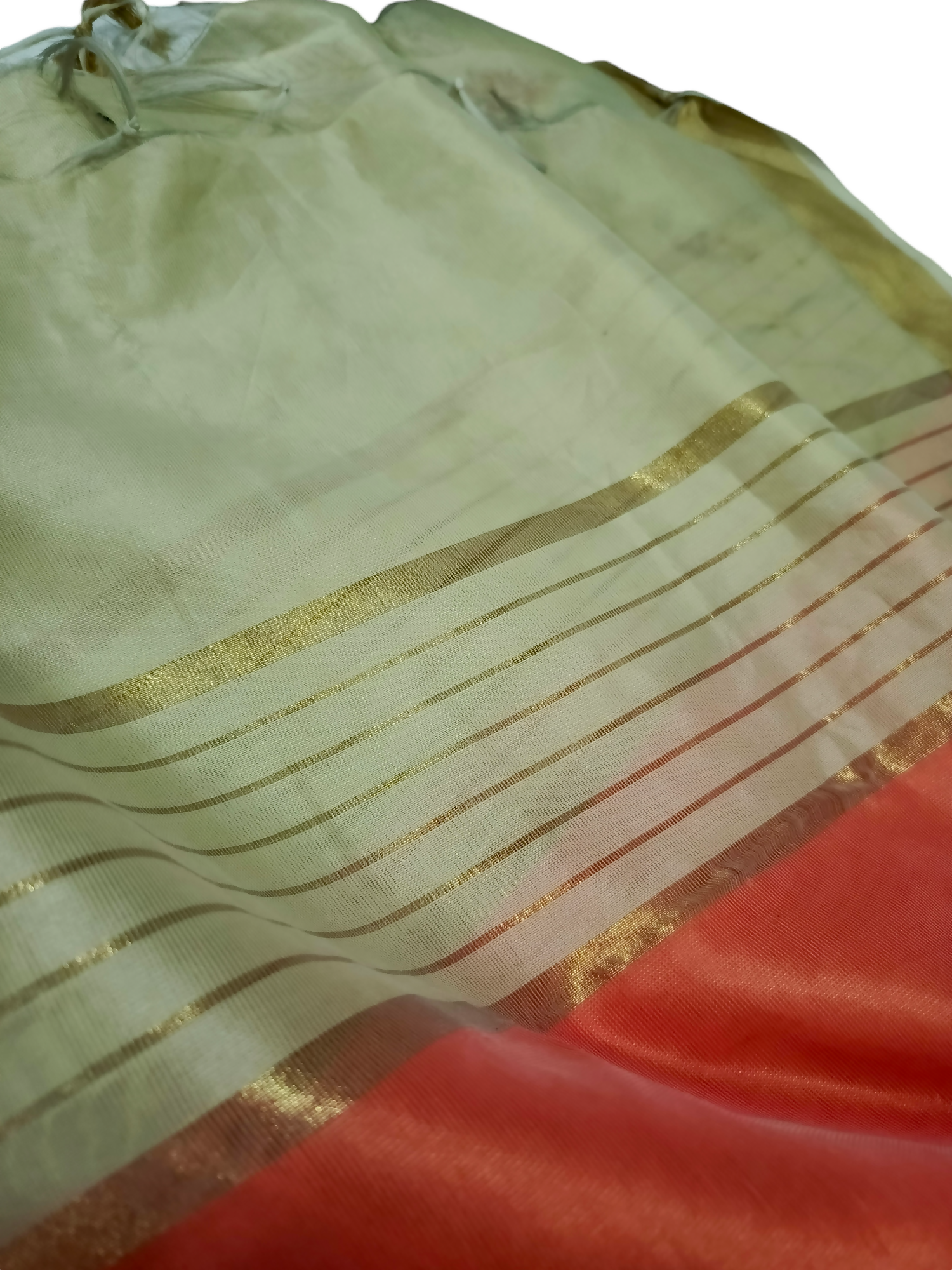 Product Description: This long dupatta has tussels at both of it's ends.These golden stripped patterns alongwith orange colours creates an eye catching contrast.