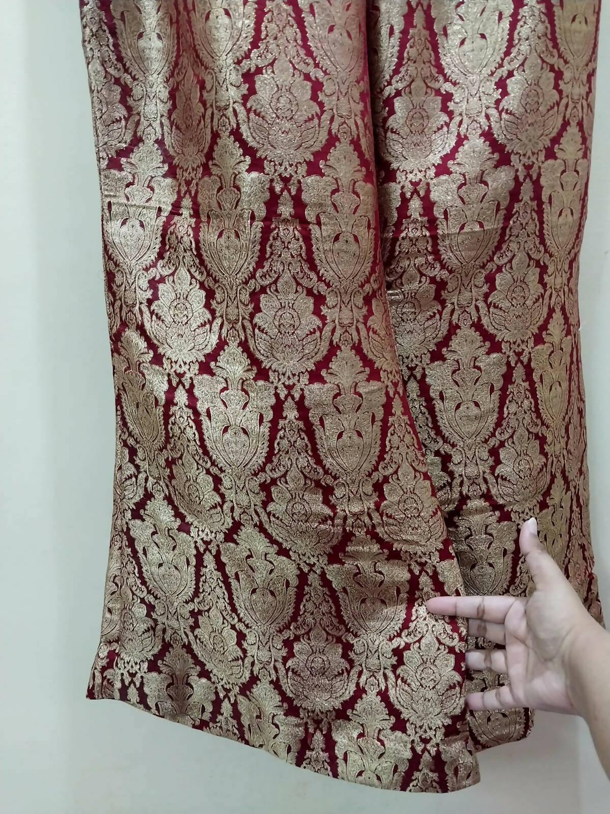 MATERIAL & MEASUREMENT Size: Large Measurements: Chest : 21 Length : 36-37 Shoulder 15 Trouser length: 39 Fabric / Material: Chiffon kameez, Jamawar Bell bottom trouser and chiffon
