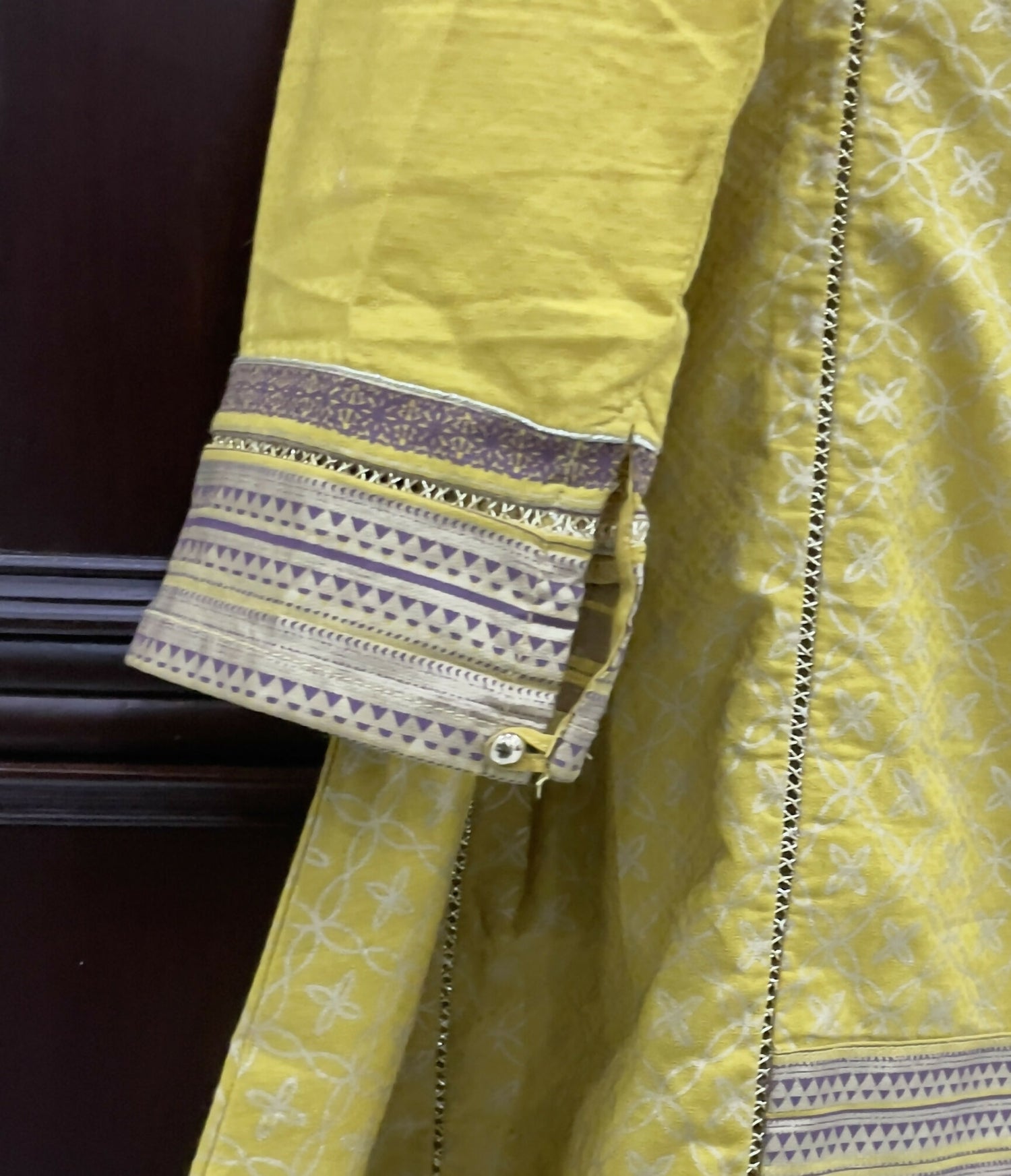 | MATERIAL & MEASUREMENT | Size: Large Measurements Chest 21 Length 34.5 Shoulder 16 Sleeves 23.5 Ghaira 38 Fabri: lawn cotton |