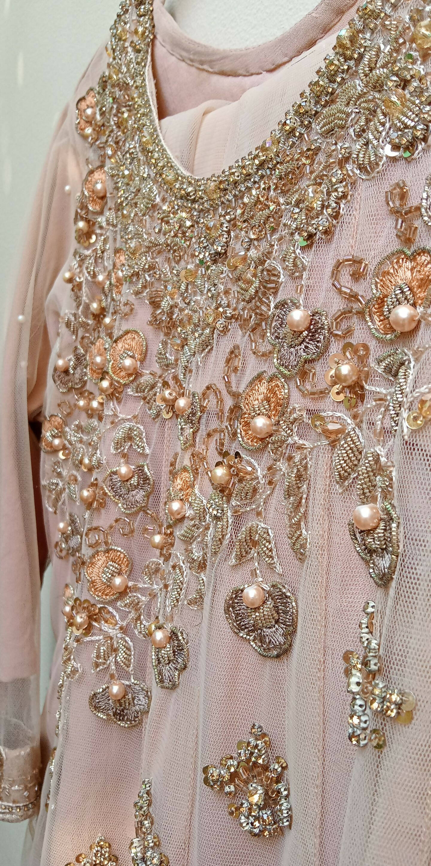 | MATERIAL & MEASUREMENT | Short Frok stuff: Net Net Dupatta Trouser: Jamawaar Shirt Length: 36 Sleeves Length: 16 Chest: 17 Trouser Length: 35 |