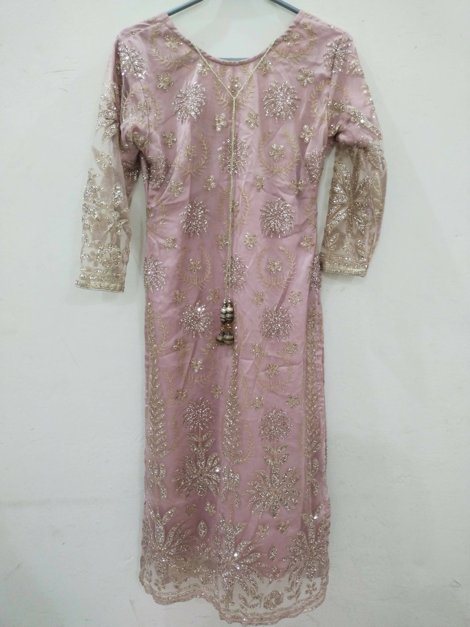 MATERIAL & MEASUREMENT Measurements ( inches) Shirt details: stuff net Shoulder: 13 Waist: 15 Chest: 18 Back: tesels with dori attached Length: 46 Sleeves length: 17 Trouser details: Stuff silk Length: 38 Bottom style: 3 stone Buttons with hocks Dupata Details: Stuff : Net 2.5 meter 2 inch extra Defect: Tesels little bit oxided Worn once Condition: 9/10 Selling price: 9000