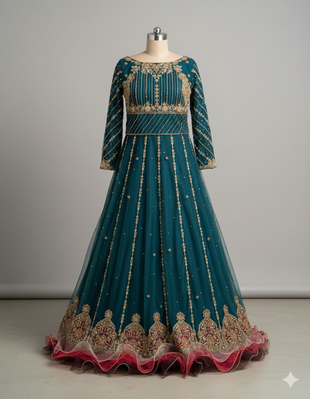 Luxurious Silhouette with its fitted, this lehnga is ideal for grand weddings, high-end galas, and any event requiring a look of undeniable, timeless opulence.