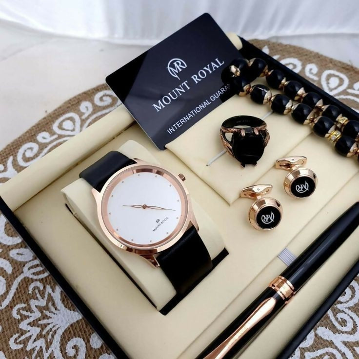 | MATERIAL & MEASUREMENT | Watch: Stainless steel casing with a durable leather or metal strap. Dial Diameter: Approx. 40mm; Strap Length: Adjustable to fit most wrist sizes. Cufflinks: High-quality metal (stainless steel or brass) with a polished finish. Size: Approx. 1.5 x 1.5 cm. Pen: Premium metal with smooth, fluid writing. Length: Approx. 14 cm. Tasbih (Prayer Beads): Crafted from natural wood or semi-precious stones. Bead Size: Approx. 8mm; Length: Approx. 25 cm. Stone Ring: Made from high-quality metal with a bold stone setting. Size: Available in standard ring sizes |