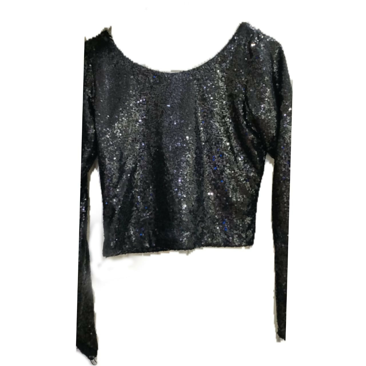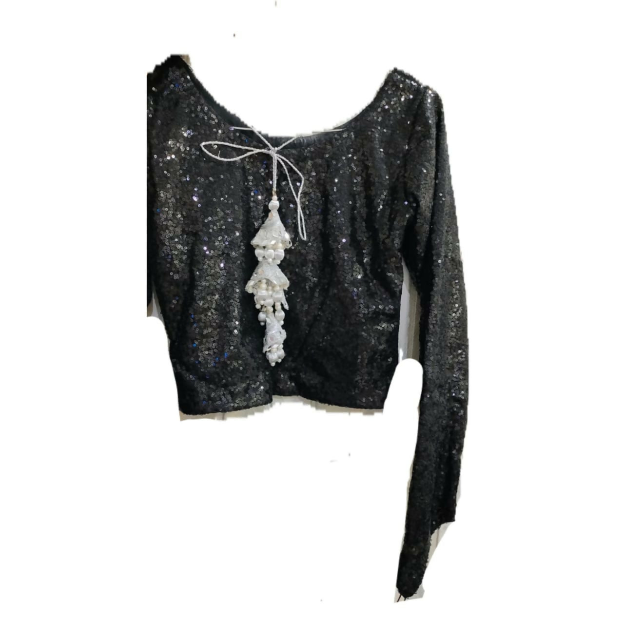 Blue chiffon saree with sitara work and black moonlight sequence blouse .