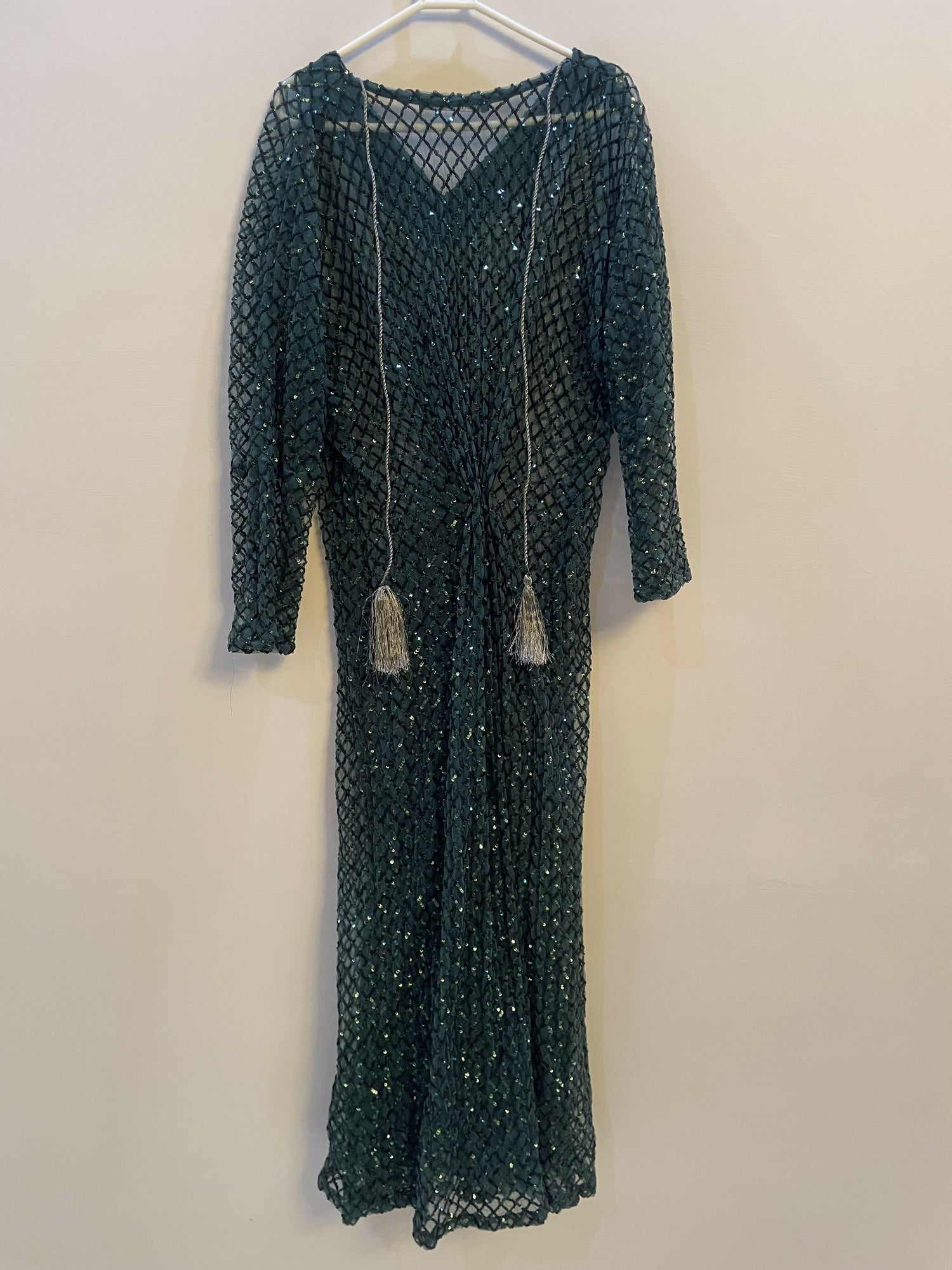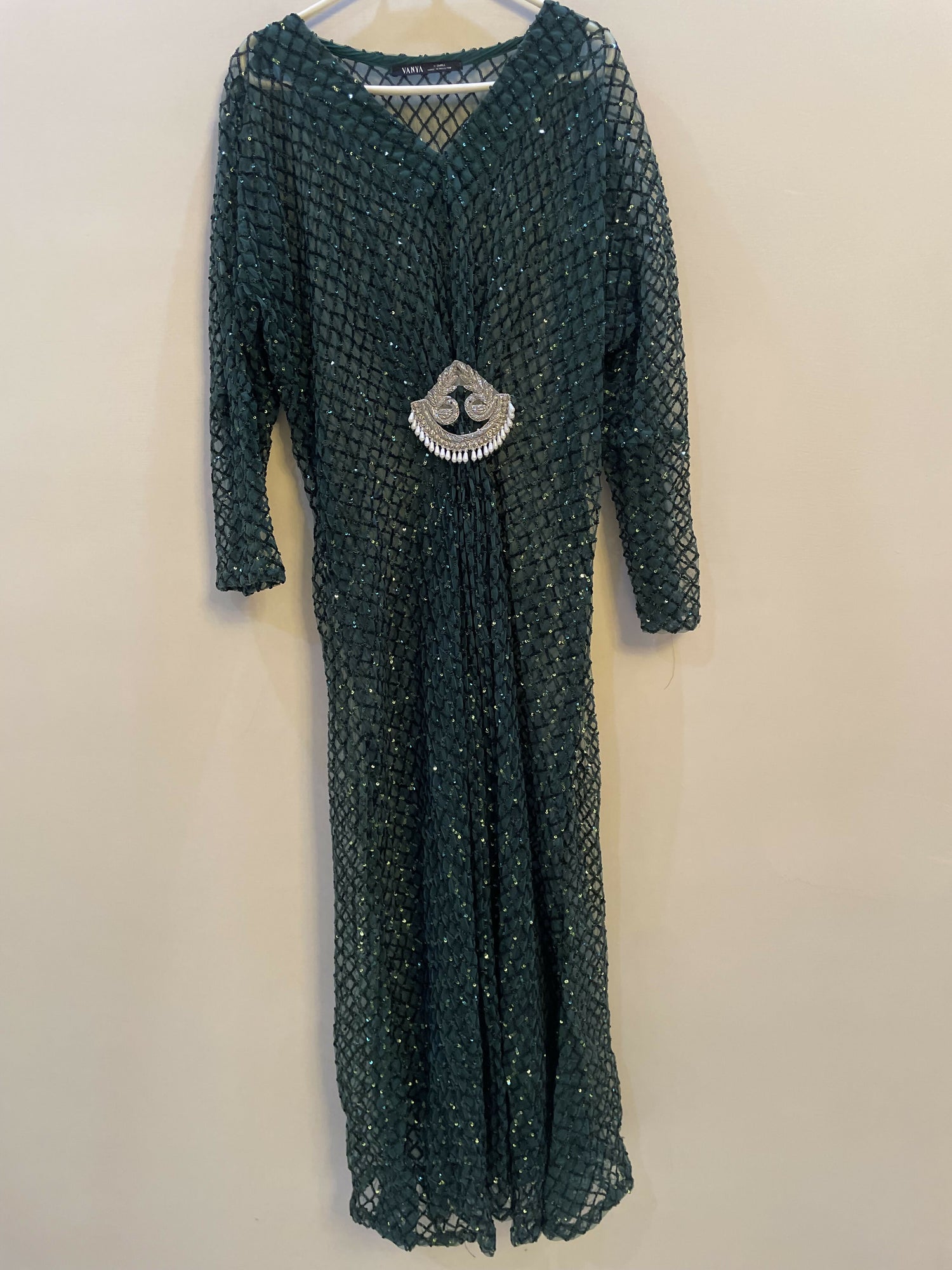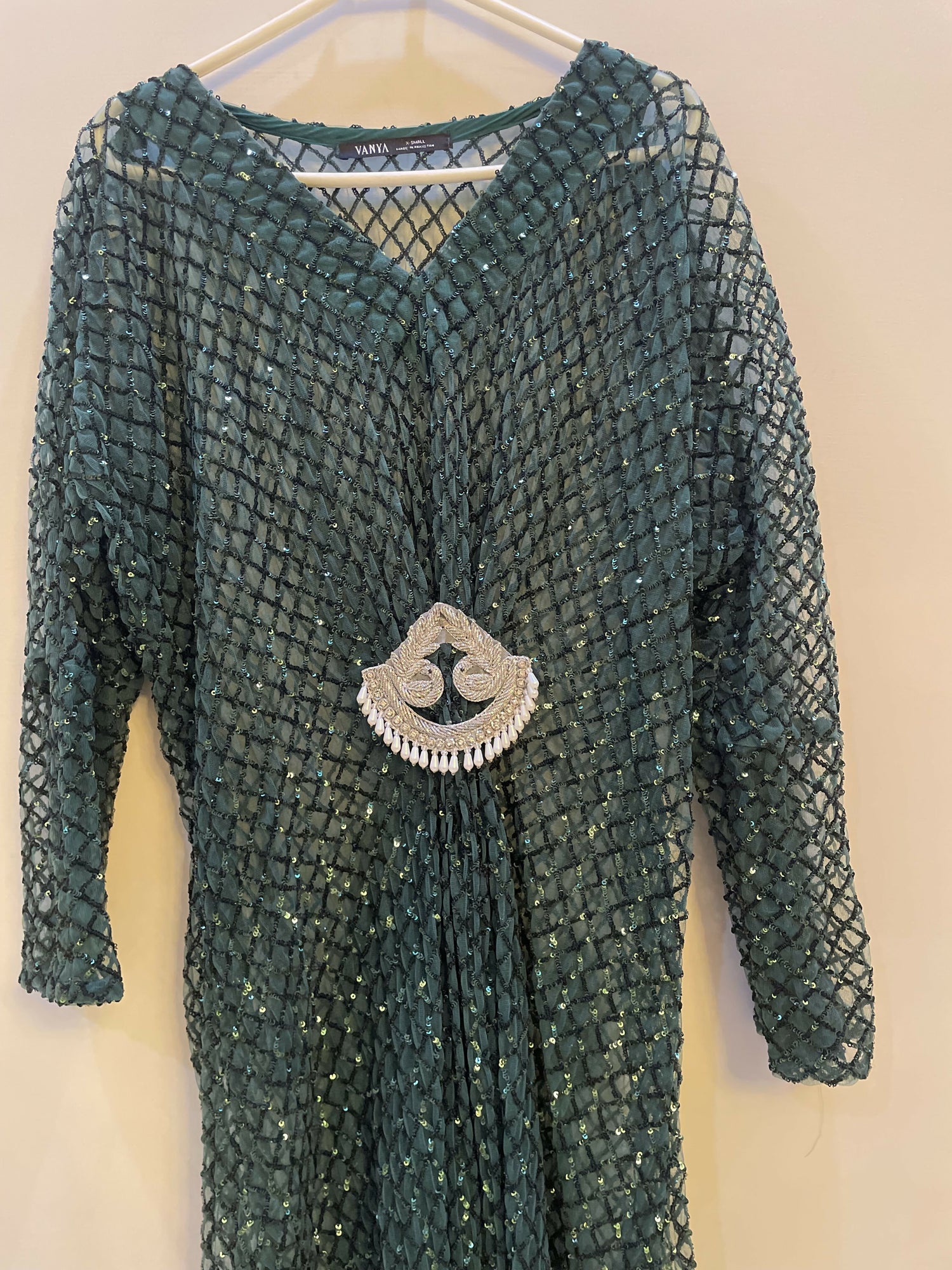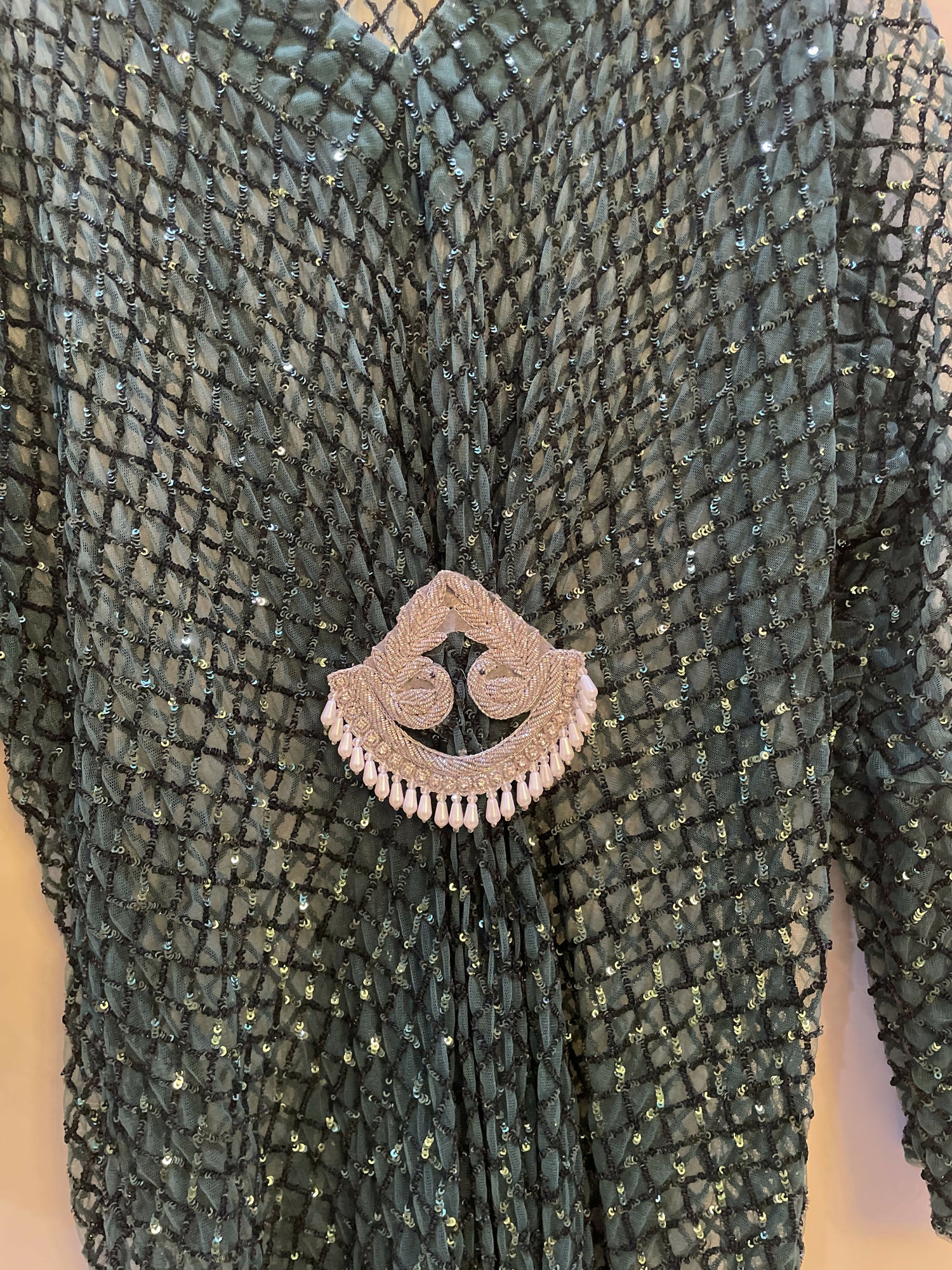 Fabric: Sequined kaftan on net with sequence work all over with black contrast and a silver motif in the middle.