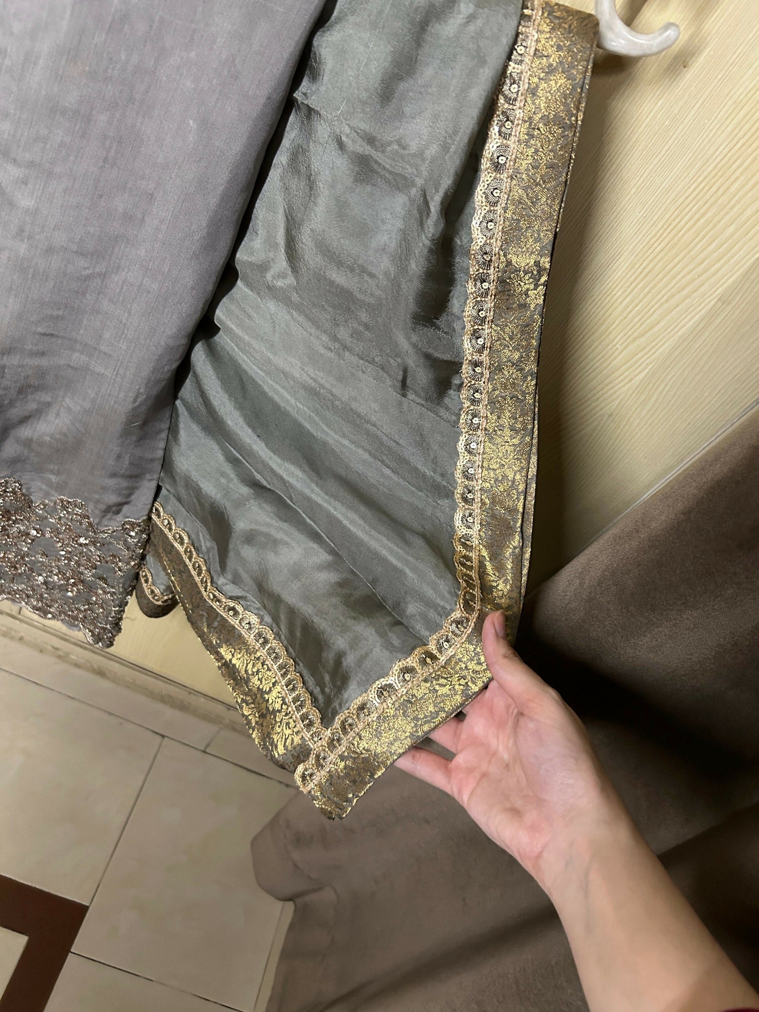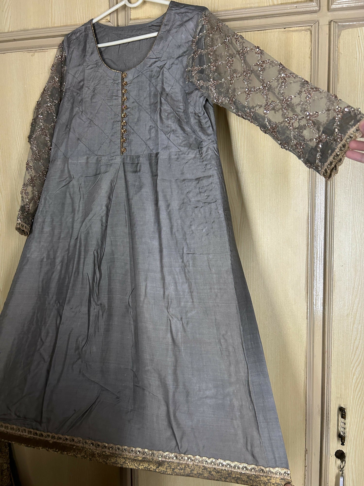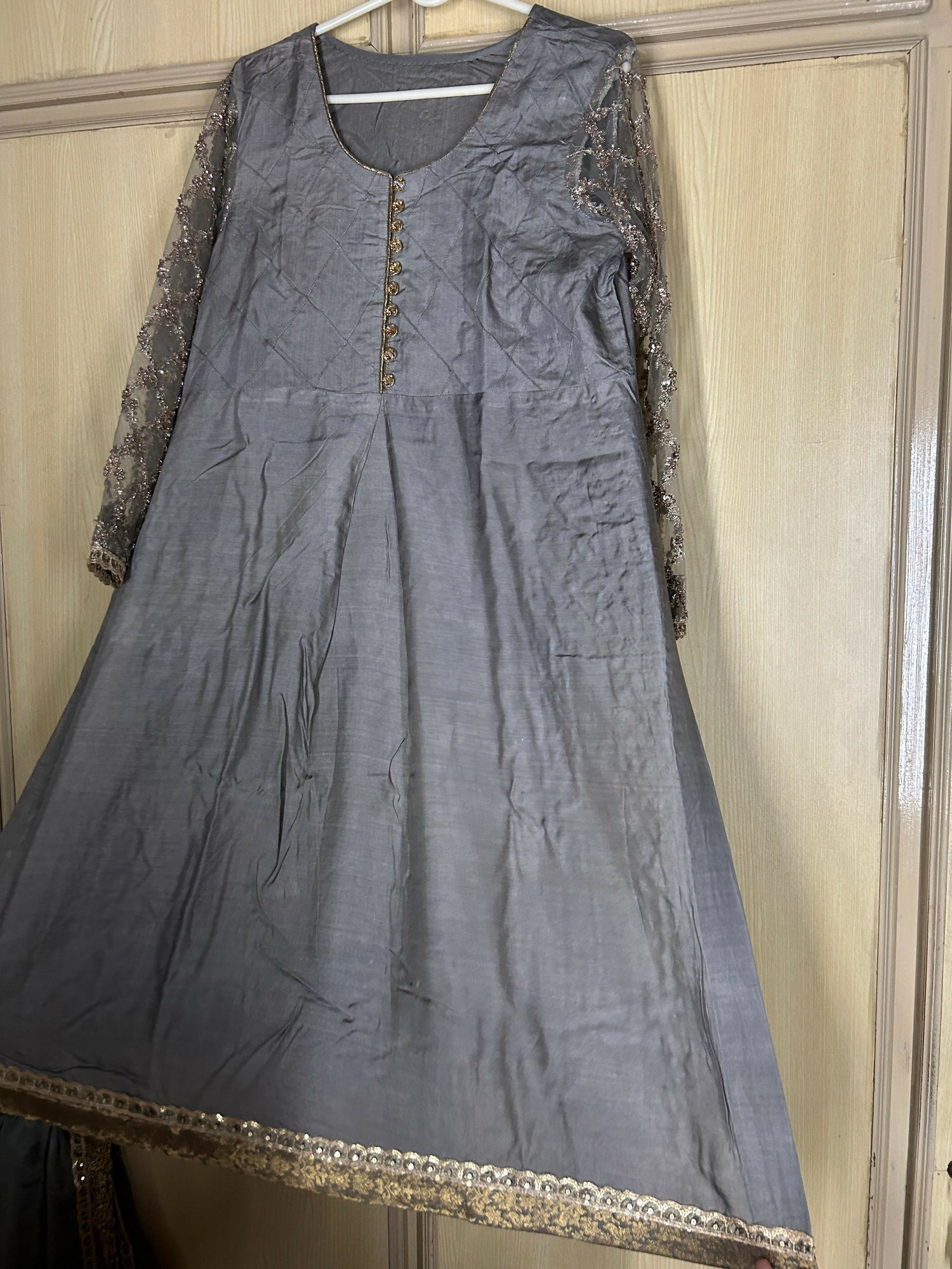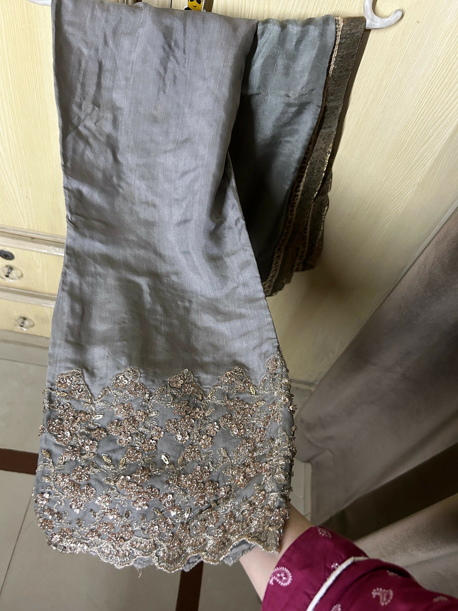 MATERIAL & MEASUREMENT Fabric: viscose with net sleeves and jamawar edging Length 41 Bell shape trouser Fabric: maroon chiffon Shoulder 14.5 Chest 20.5 Hip size 22.5