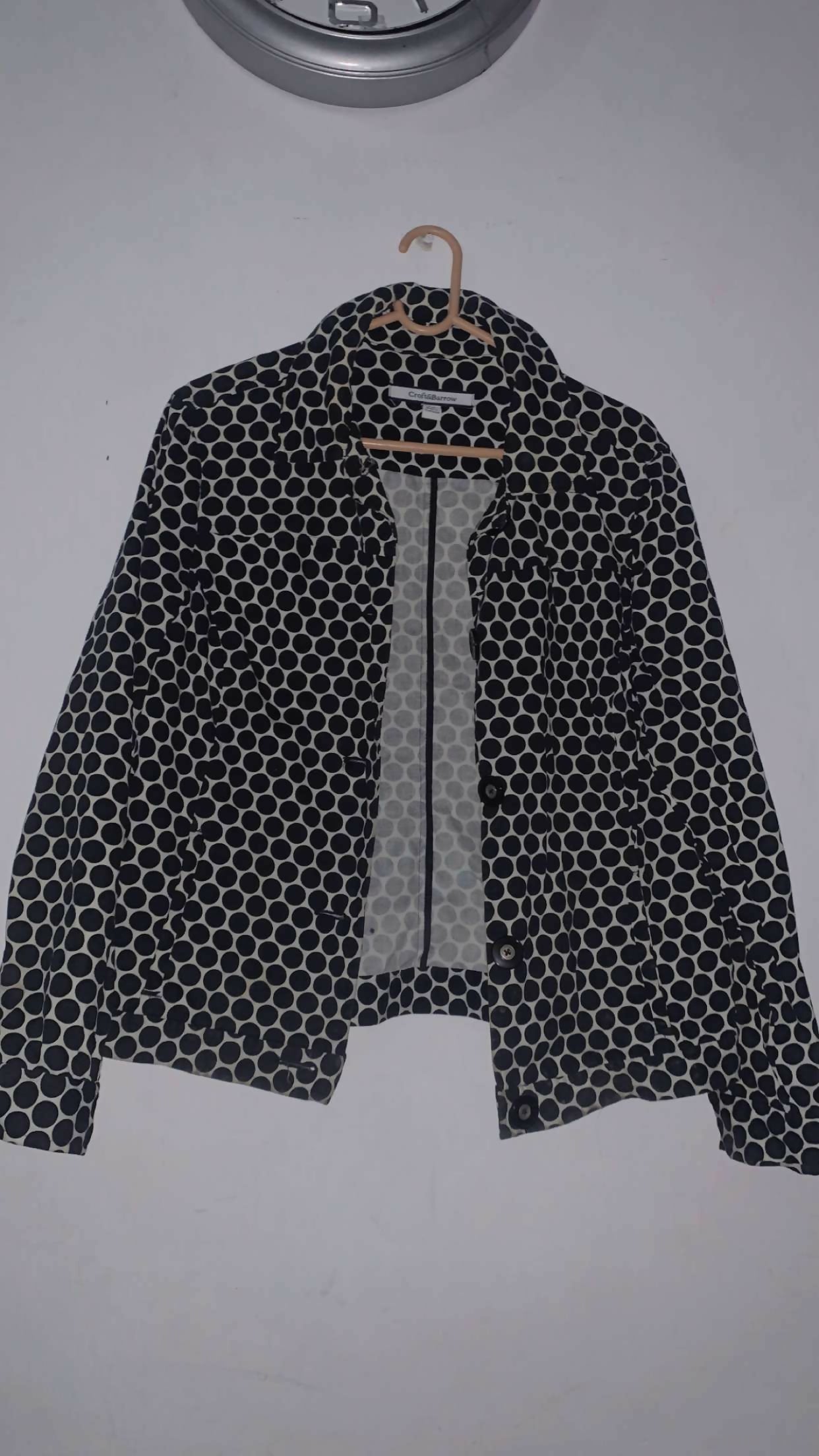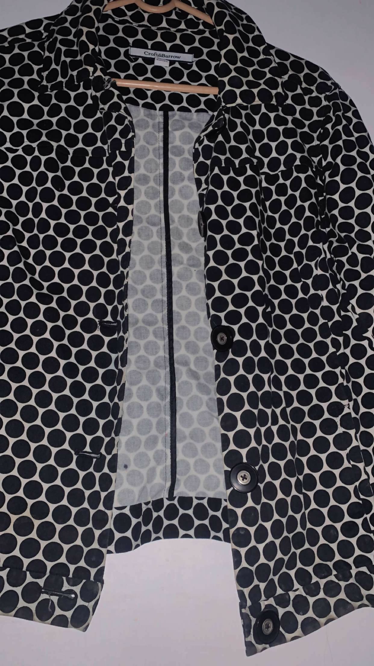 Stylish black & white polka‑dot button‑front winter jacket crafted from thick, cozy fabric with a sleek graphic circle pattern. The coat features classic button closure, long sleeves, and a modern fit that gives an interesting, eye‑catching look. Medium size. It’s very comfortable and perfect for winter wear, adding warmth and a trendy, personalized style to your seasonal outfits.