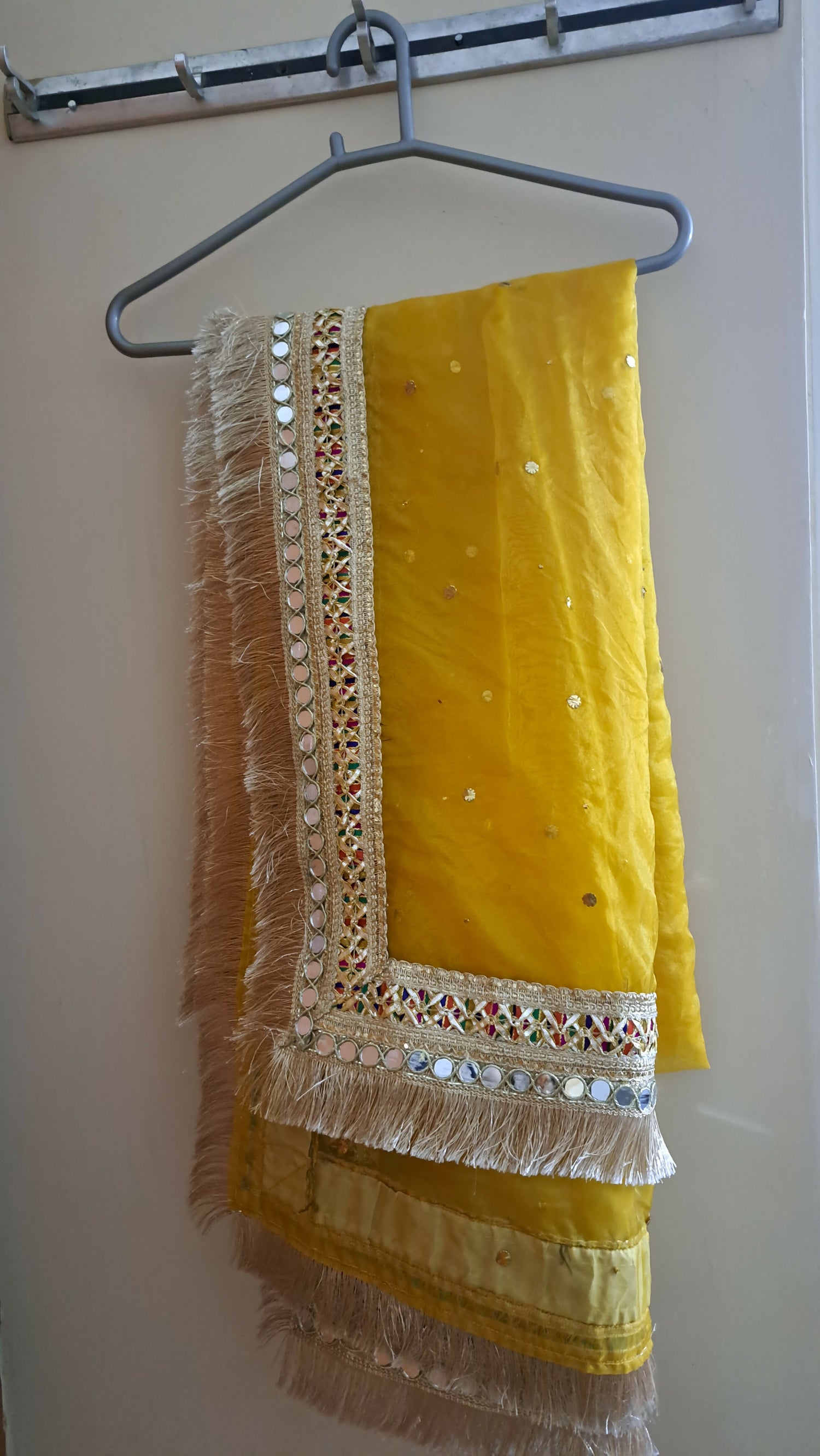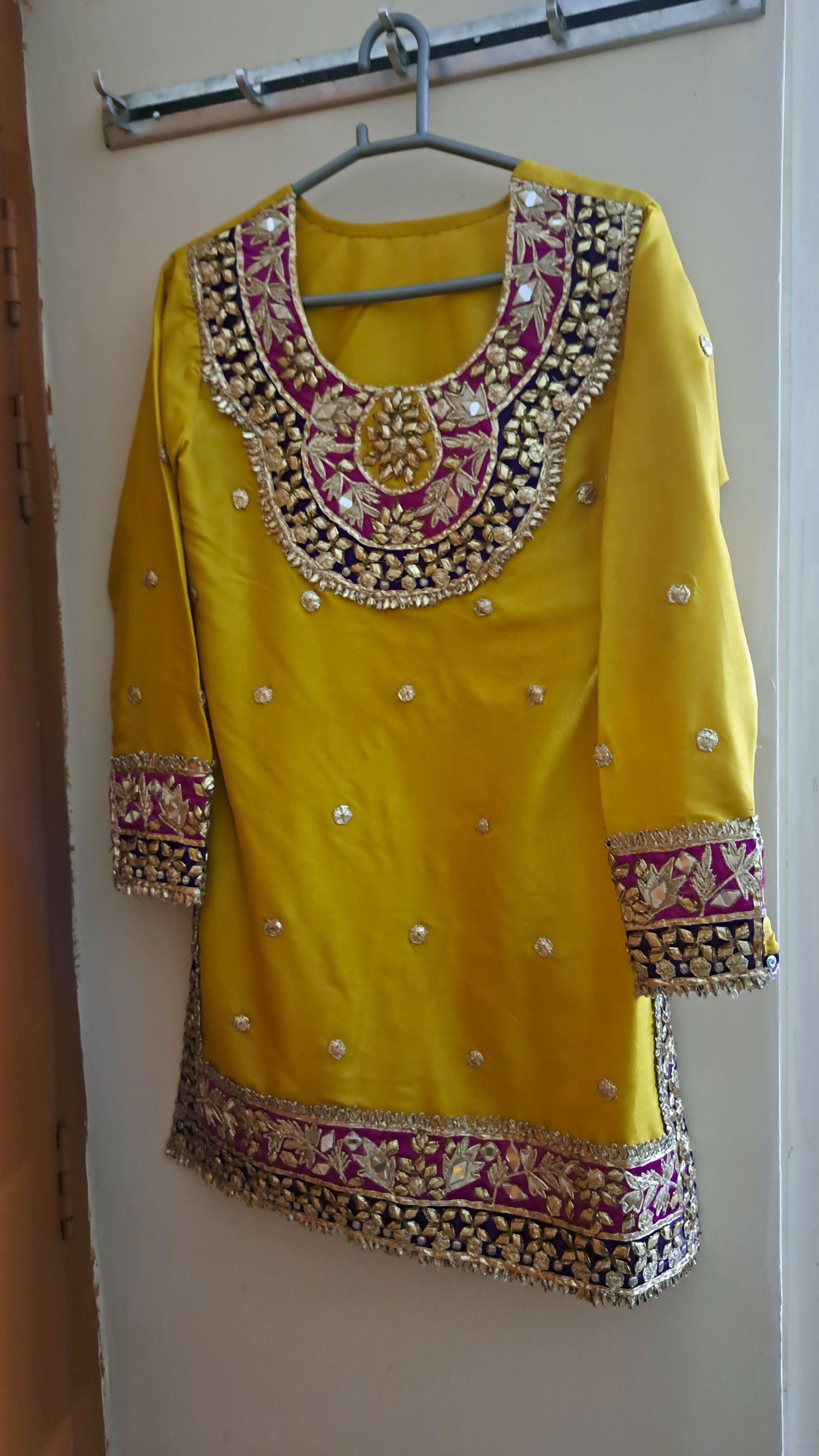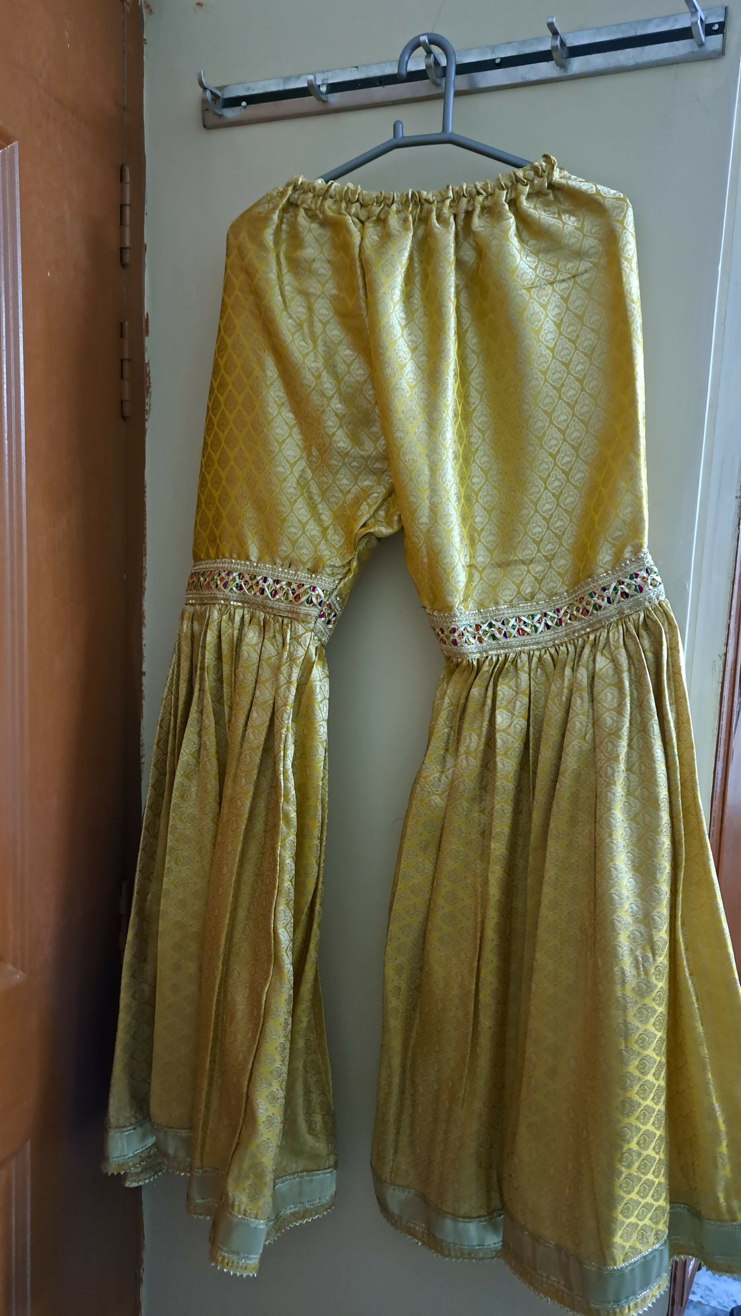 Description: Yellow raw silk shirt with gotta work on neckline, sleeves and hem. Jamawar gharara with laces. Organza dupatta with gotta border.