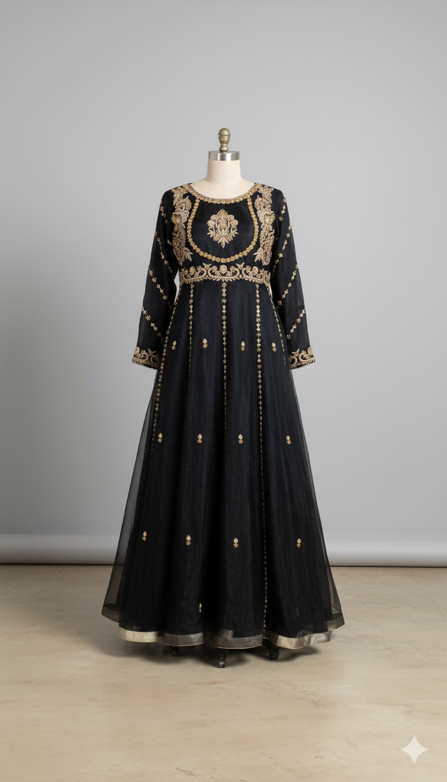 Long Frok with dazzling gold embroidery and Tissue fabric.