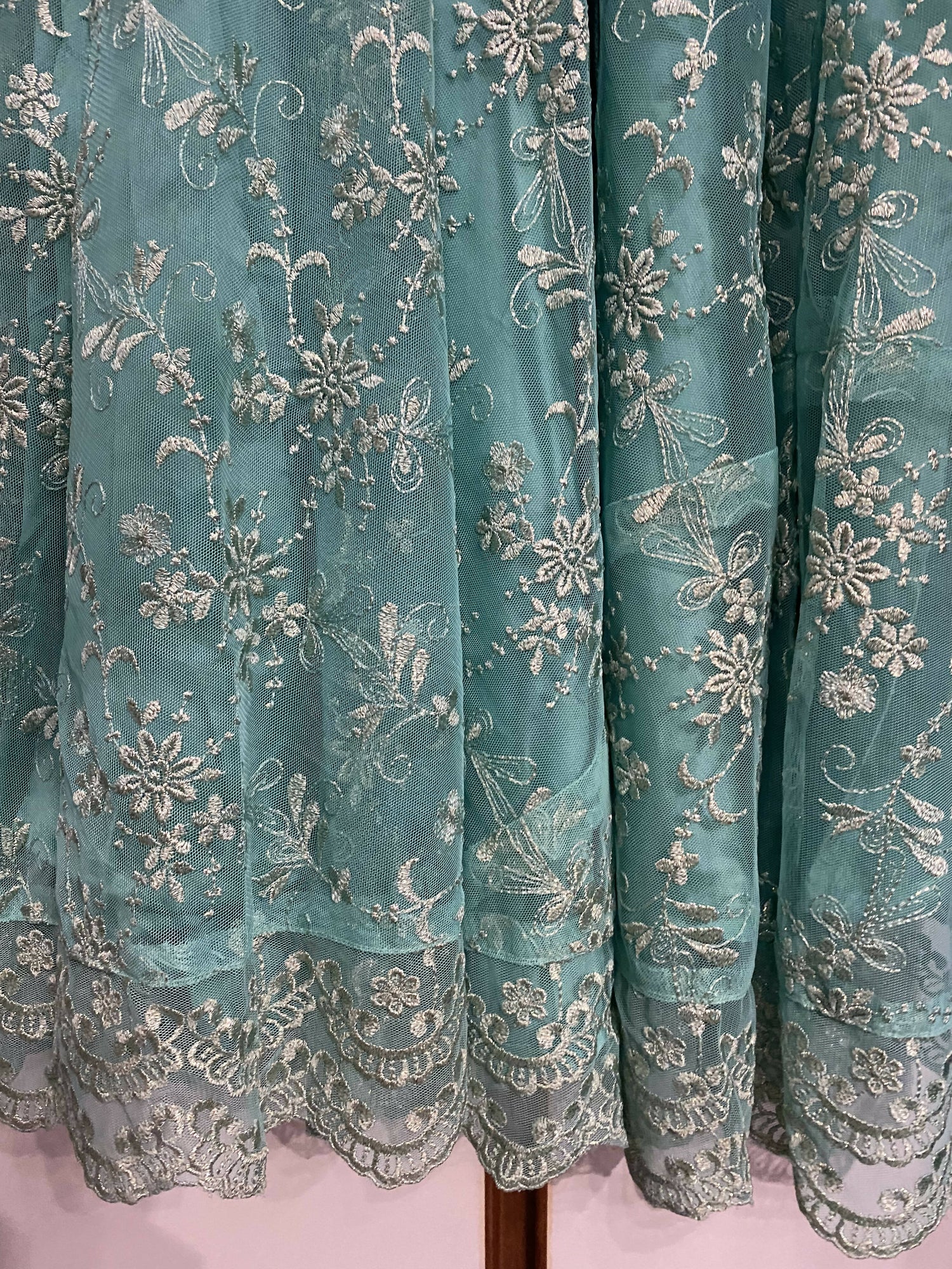 MATERIAL & MEASUREMENT Material: Embroidered Net Measurements Chest 18 Length 58 Shoulder 13