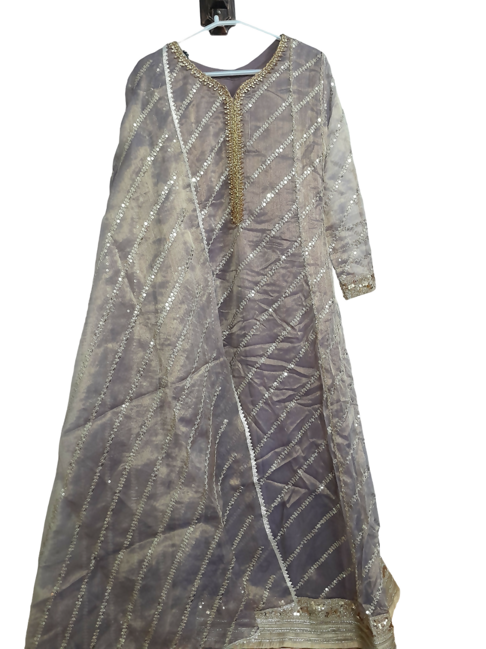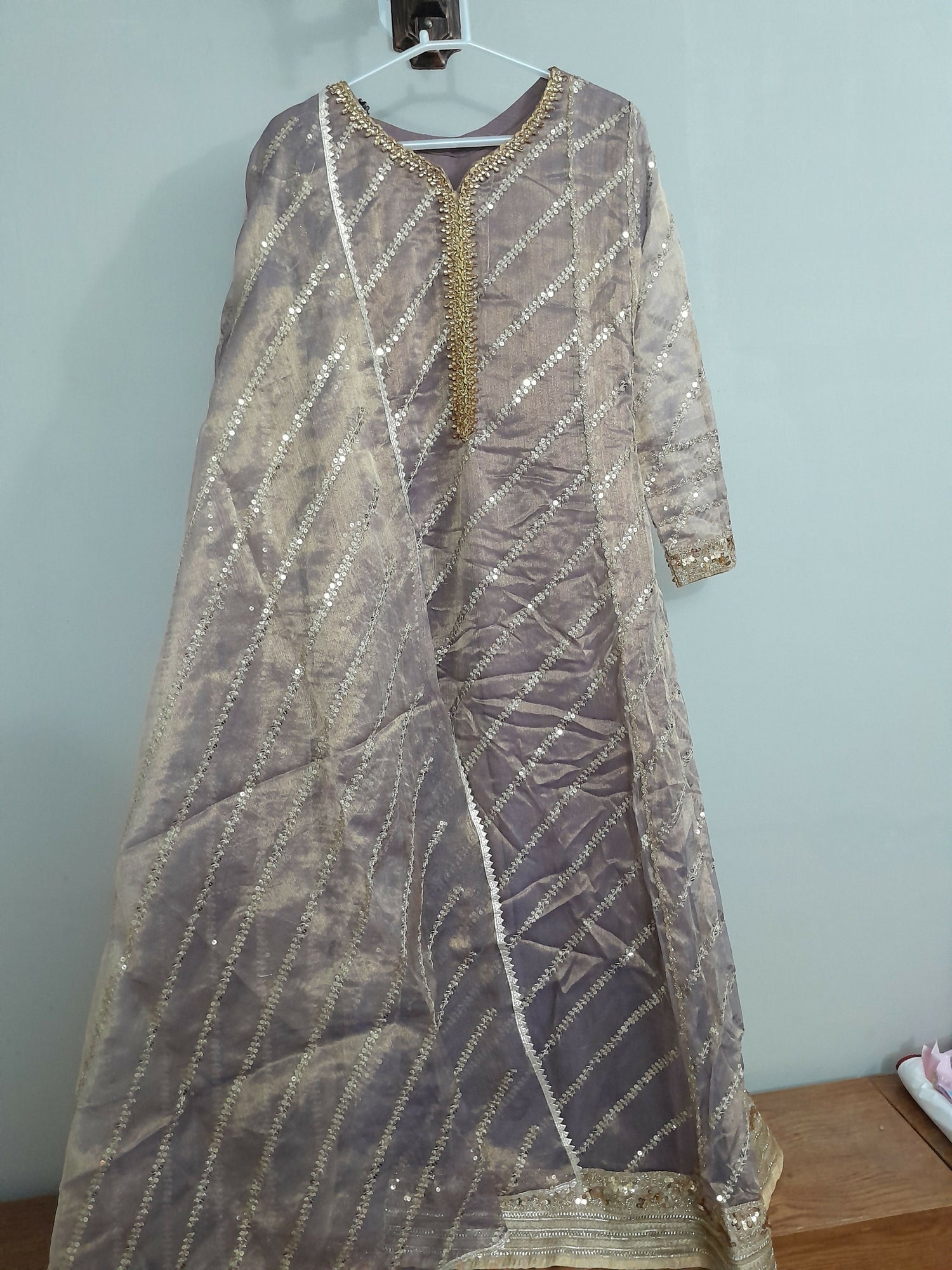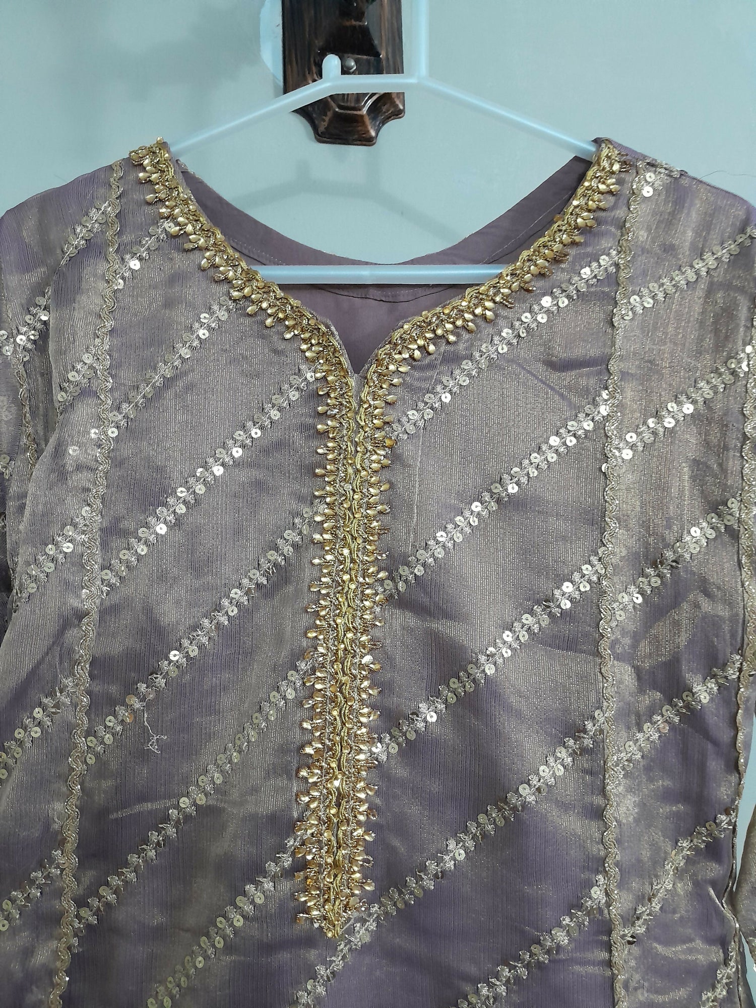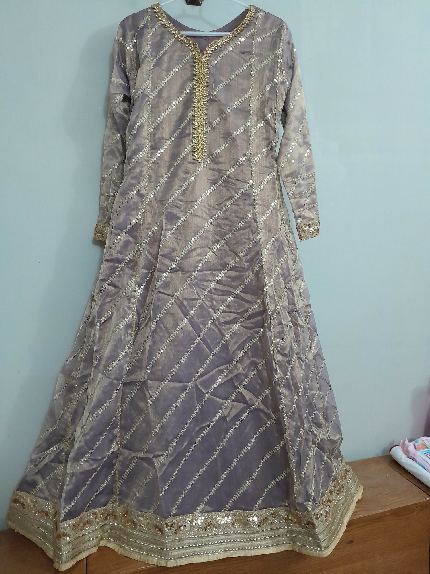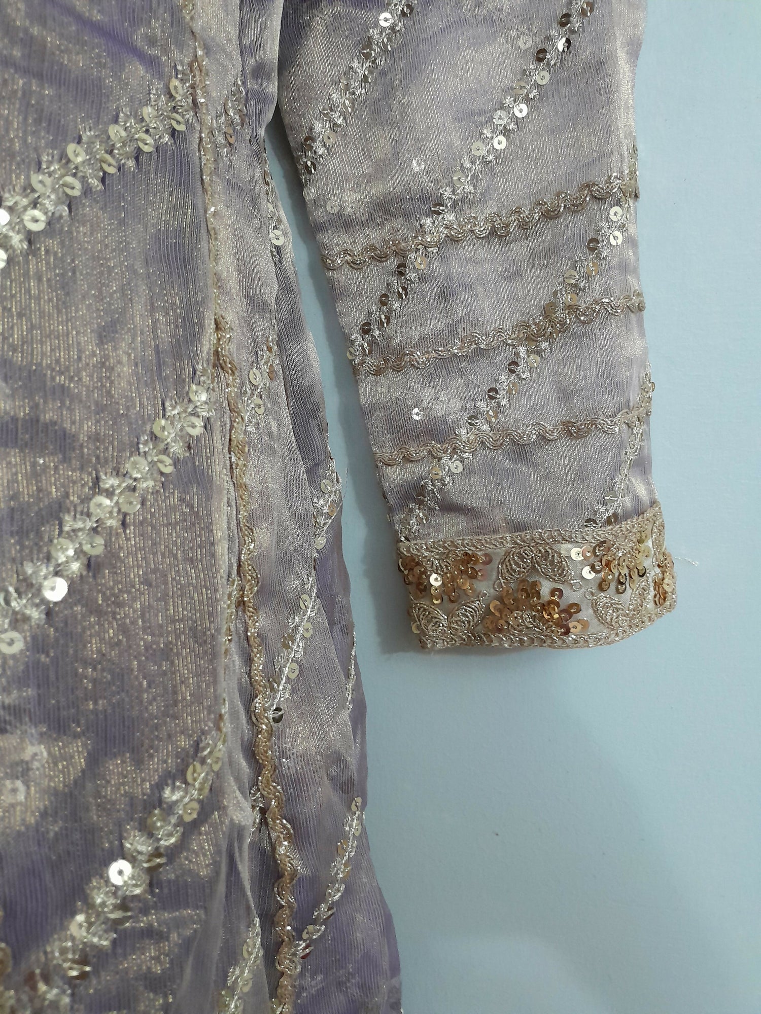 | MATERIAL & MEASUREMENT | fabric material : organza condition: 9/10 measurements Chest :18( adjustable you can increase the size ) Shoulder: 15.5 inch Sleeves: 21.5 Length: 52.5 trouser length: 40 |