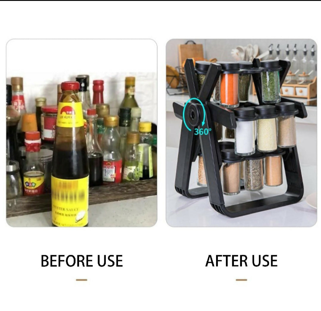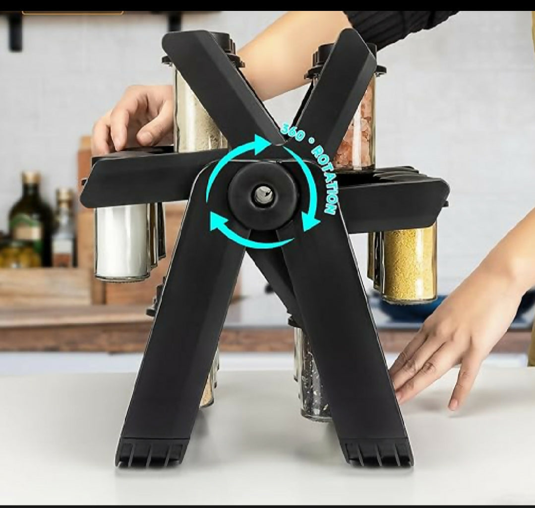 | MATERIAL & MEASUREMENT | 1. _18 Spice Capacity_: Store and display up to 18 different spices or seasonings. 2. _Rotating Design_: Easy access to all spices with a simple turn. 3. _Space-Saving_: Compact design maximizes kitchen counter space. 4. _Ferris Wheel Style_: Unique and stylish design adds a touch of fun to your kitchen. 5. _Sturdy Construction_: Durable material ensures long-lasting use. 6. _Easy to Clean_: Simple design makes it easy to wipe clean. 7. _Adjustable_: Can be placed on kitchen counter, table, or shelf. 8. _Perfect for Home Cooks_: Great for organizing spices, seasonings, and oils. 9. _Convenient_: Keeps frequently used spices within easy reach. 10. _Adds Kitchen Decor_: Modern and sleek design enhances kitchen decor. |