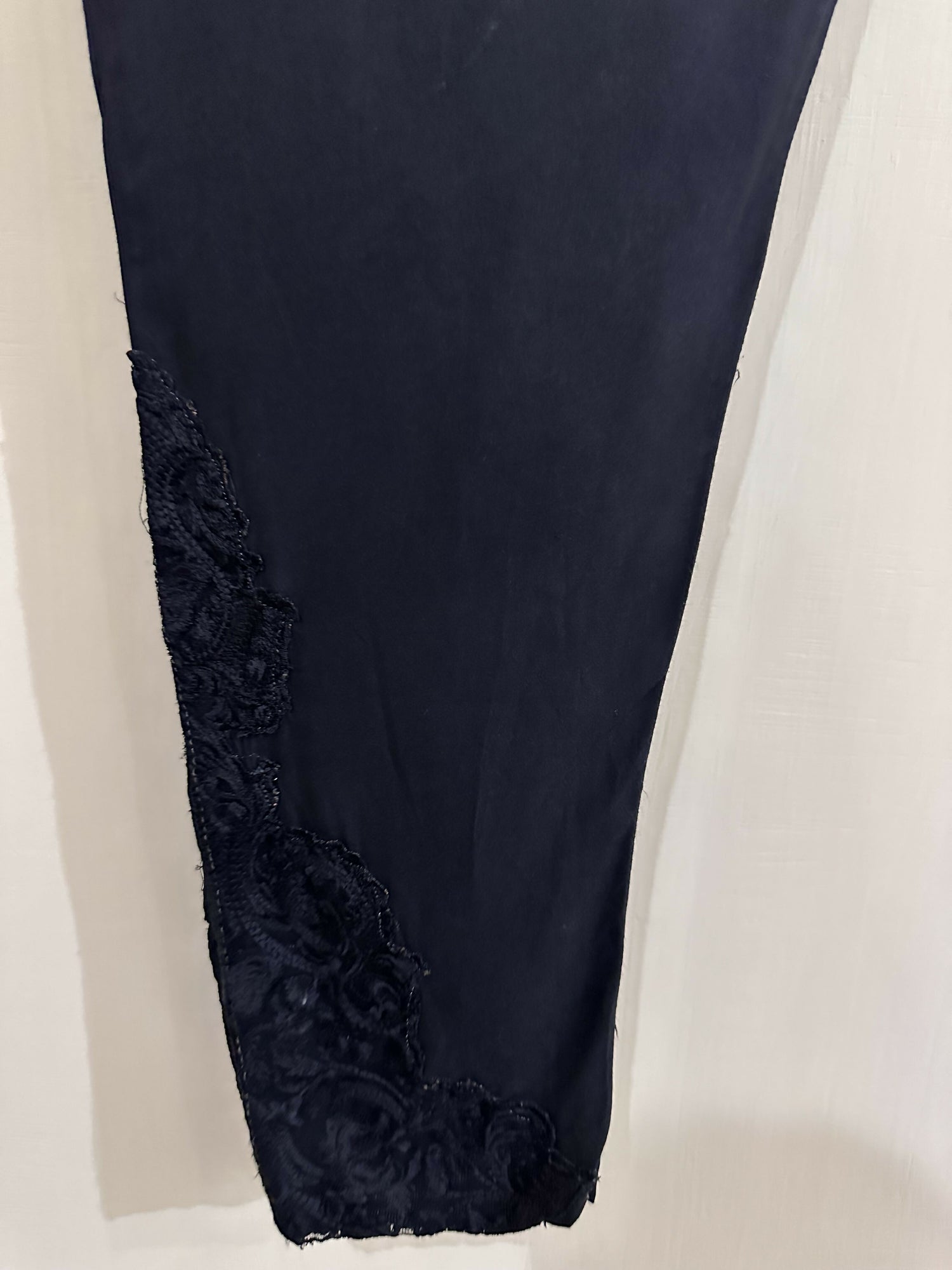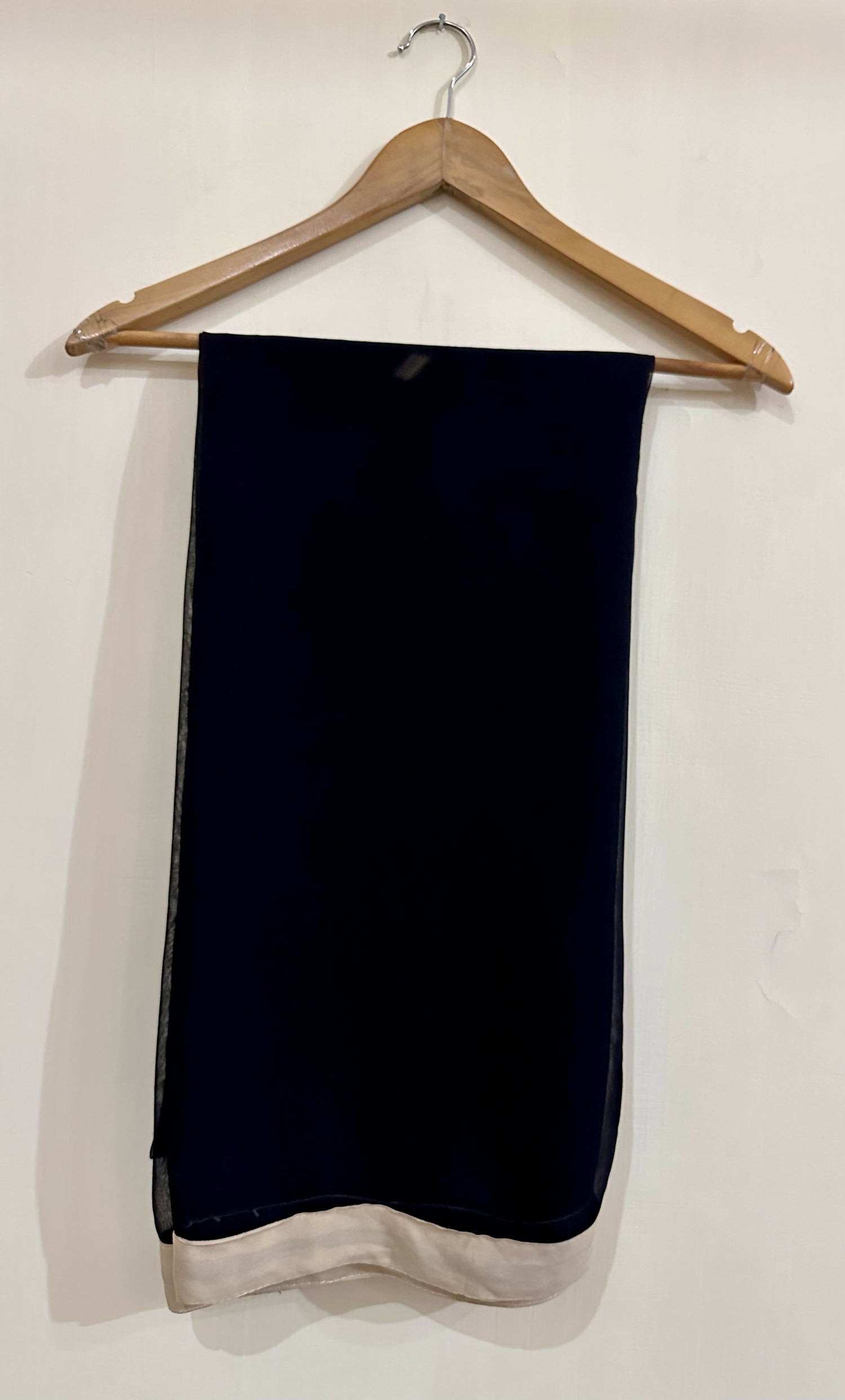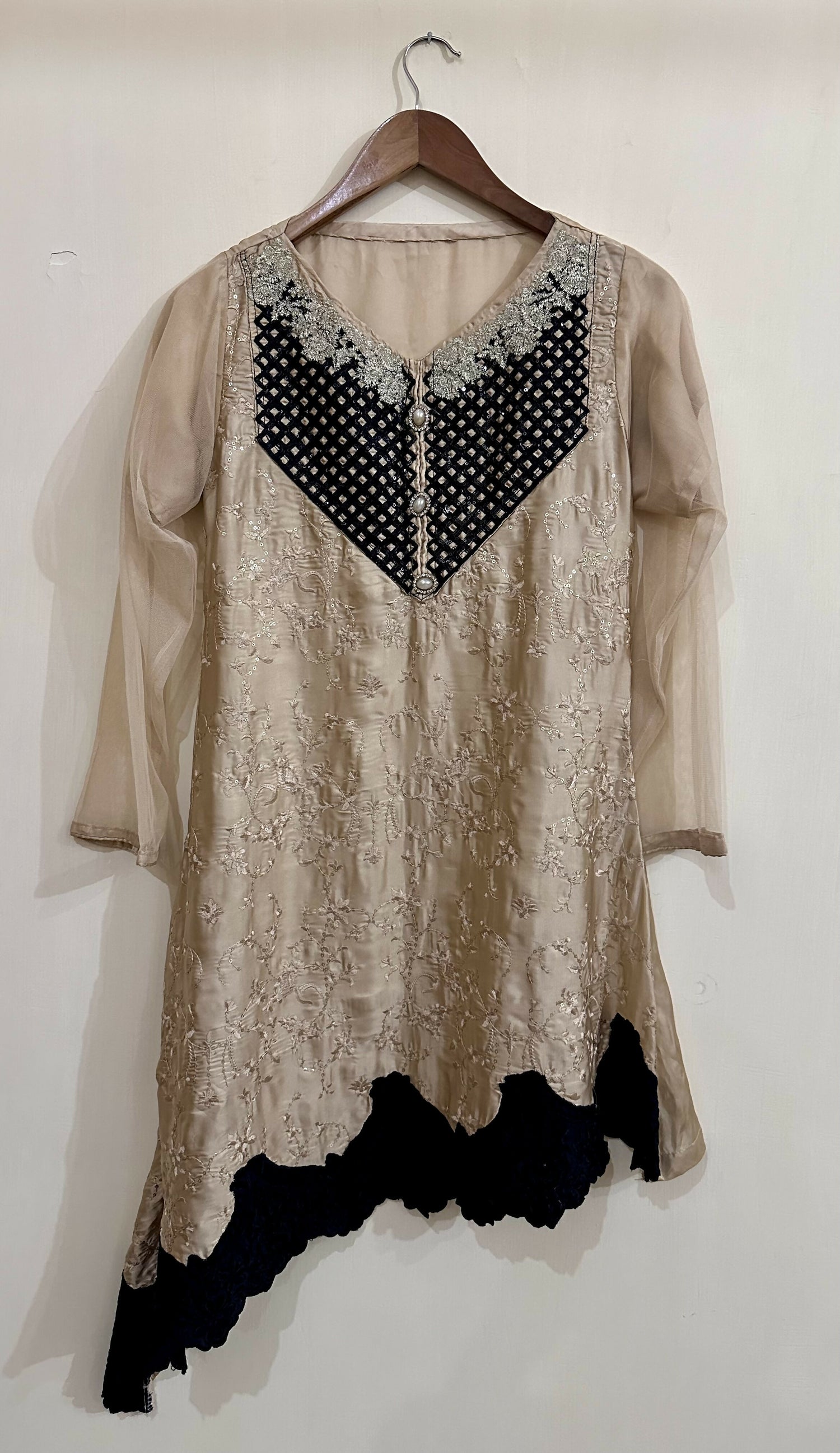 This 3-piece dress includes luxurious satin silk shirt with stretchable trouser and dupatta. The shirt features a unique design with one side extending longer than the other. This asymmetrical detail adds a modern, elegant touch. The dress has been worn only once, and is in excellent condition.