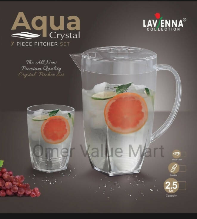 | MATERIAL & MEASUREMENT | 7 pcs pitcher set .one jug and 6 glasses. .brand new. .premium quality plastic. .2.5 liters capacity. .good for indoor and outdoor parties. |