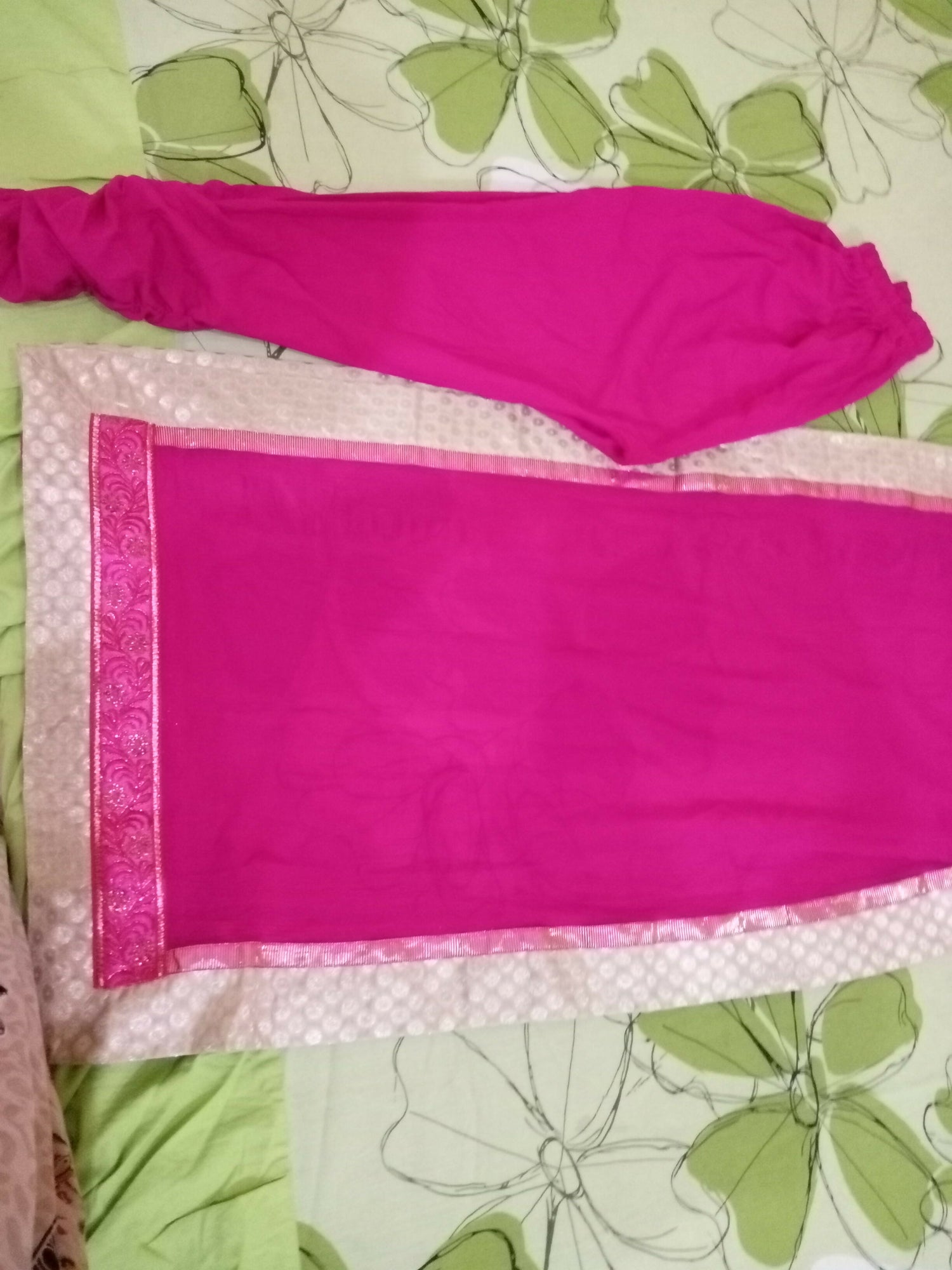 MATERIAL & MEASUREMENT Anarkali shifon frock with pajama and dupata. Shoulder: 13 Chest: 17 Waist: 15 Length: 42 Sleeves : fited with chunn Traoser length: 38 with chunn